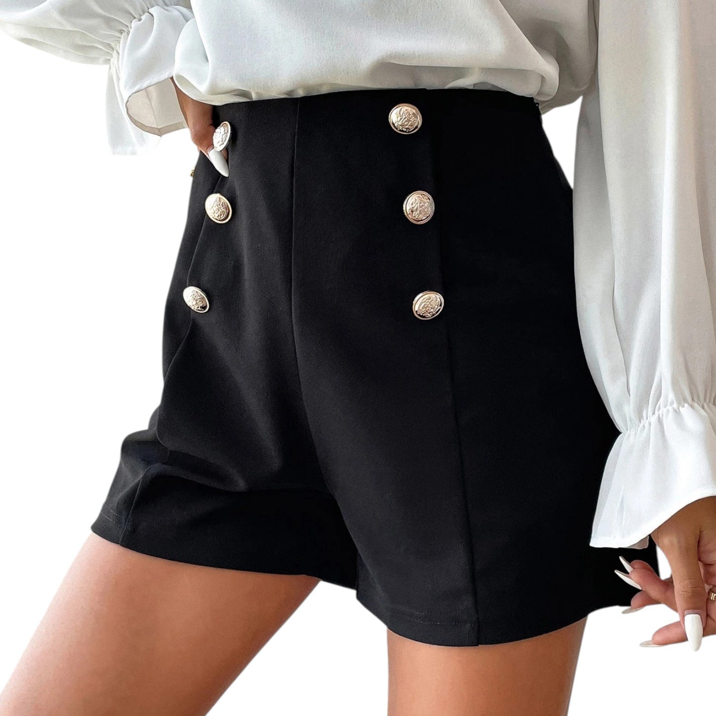 Címke nélküli, fekete, magas derekú rövidnadrág, elől arany színű dekoratív gombokkal, hátul cipzáros rögzítéssel.