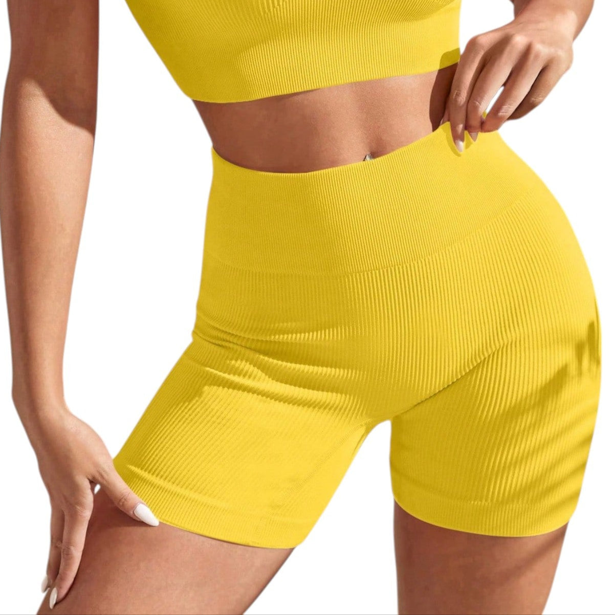Címke nélküli, sárga színű, bordázott anyagból készült rövidnadrág.