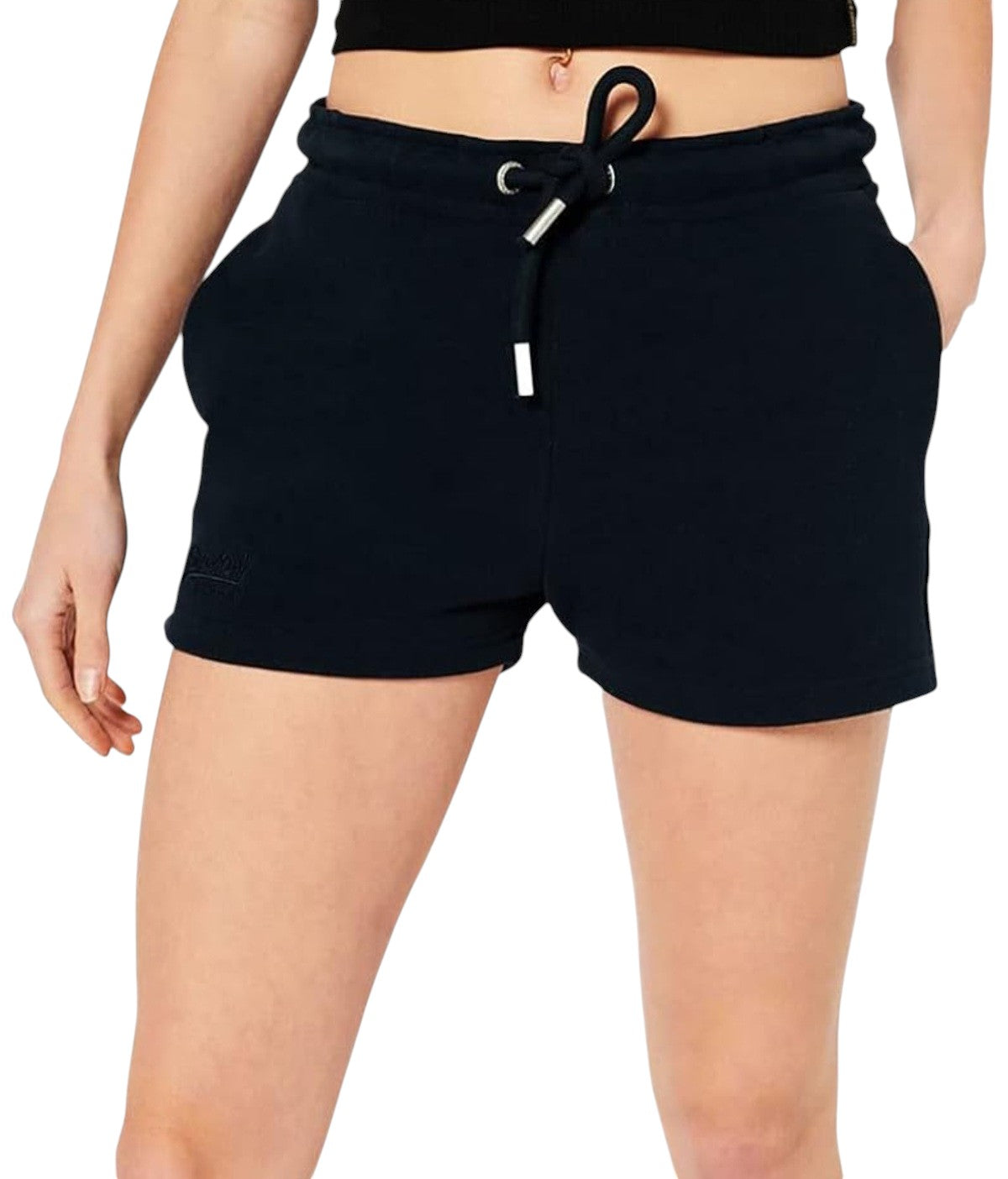 Címke nélküli, fekete, pamutdzsörzé, melegítő rövidnadrág fazon, gumis derék húzózsinórral, SuperDry hímzett logó az egyik száron.