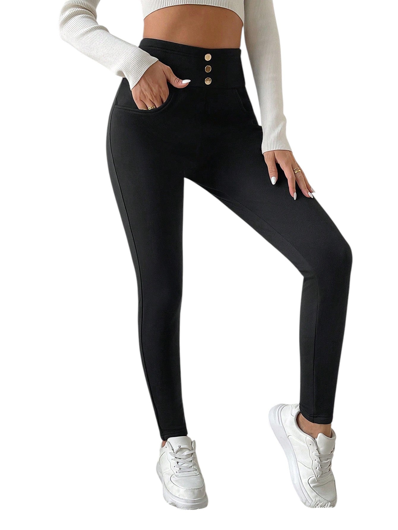 Címke nélküli, fekete, magas derekú, elöl három gombos, testhezálló nadrág