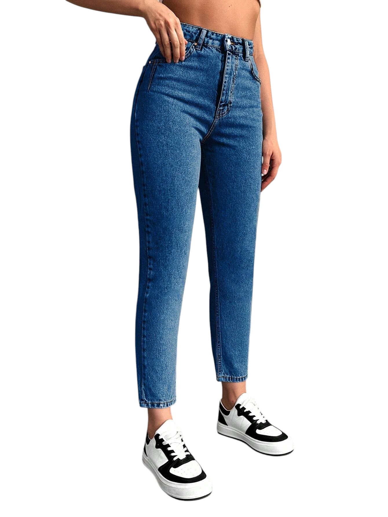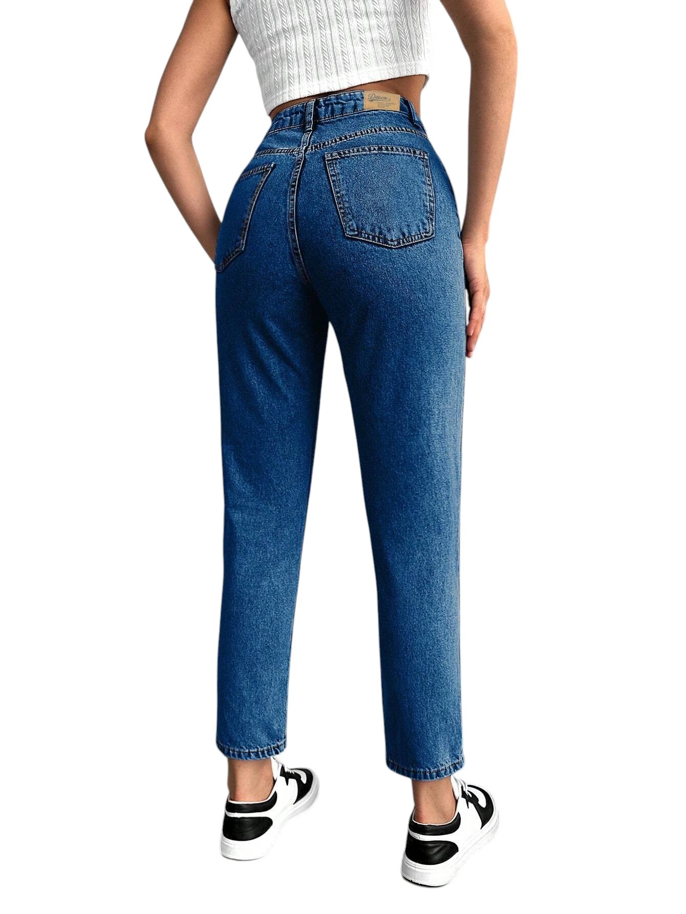 Címke nélküli, kék, magas derekú, egyenes szárú farmer