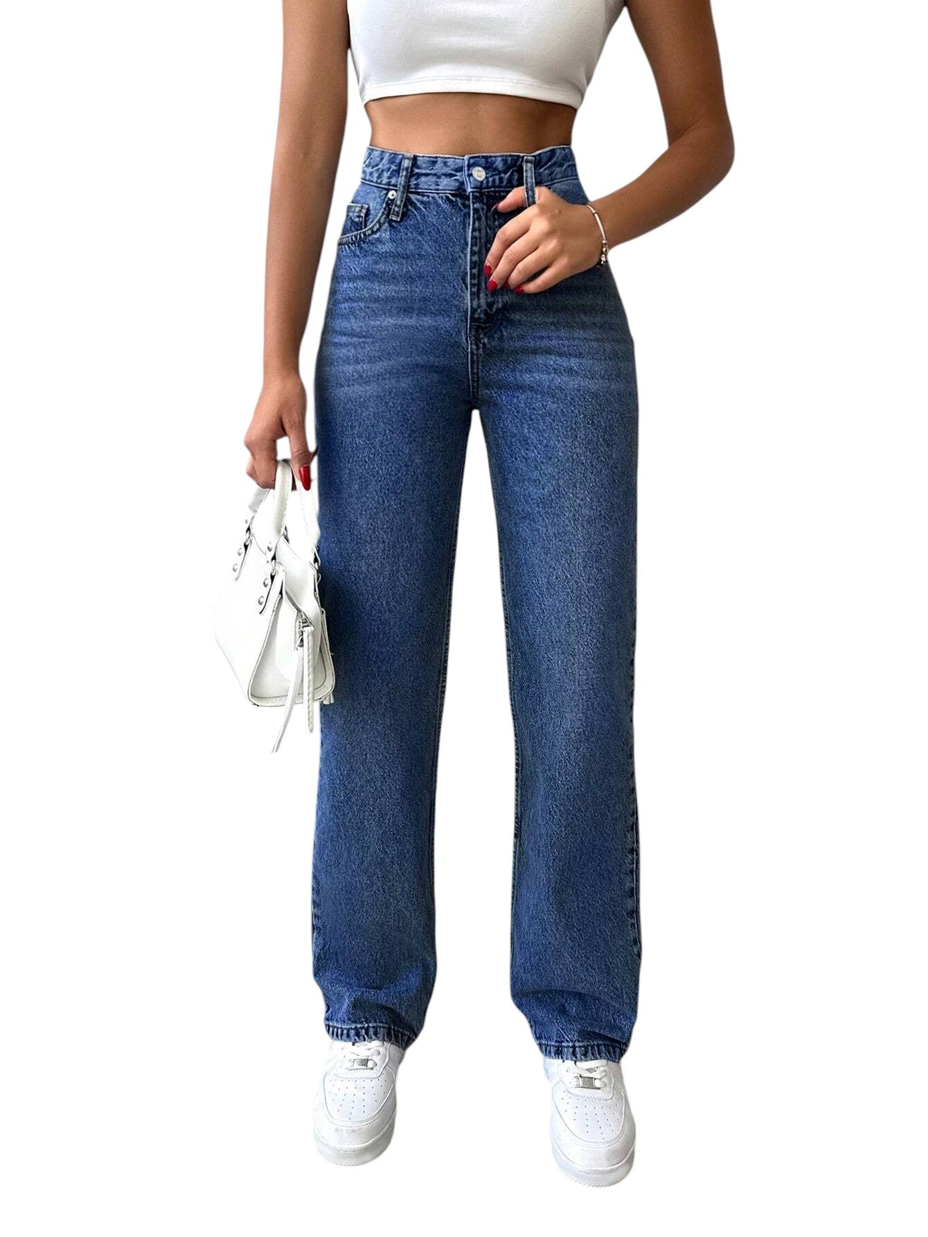 Címke nélküli, kék, magas derekú, egyenes szárú farmer