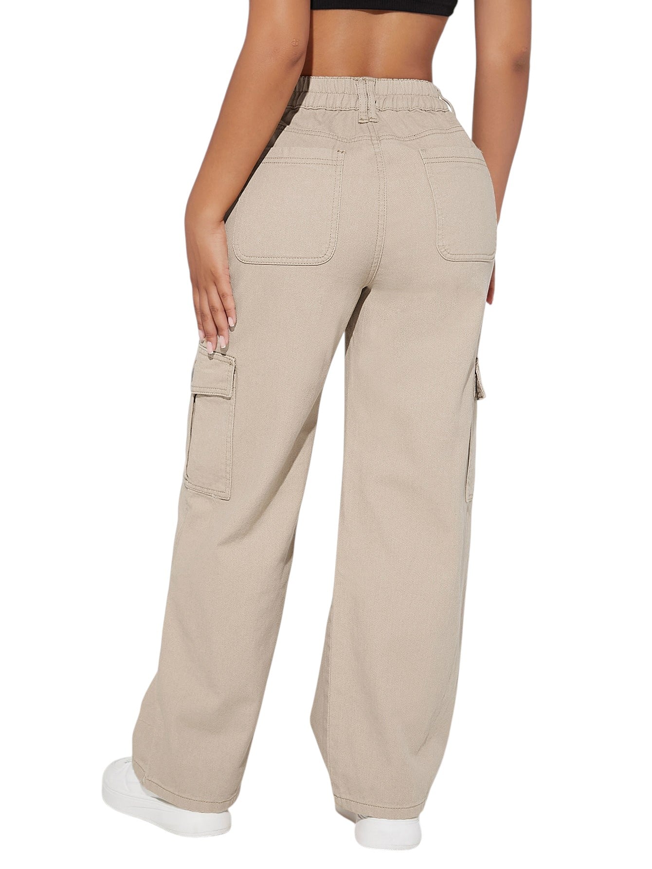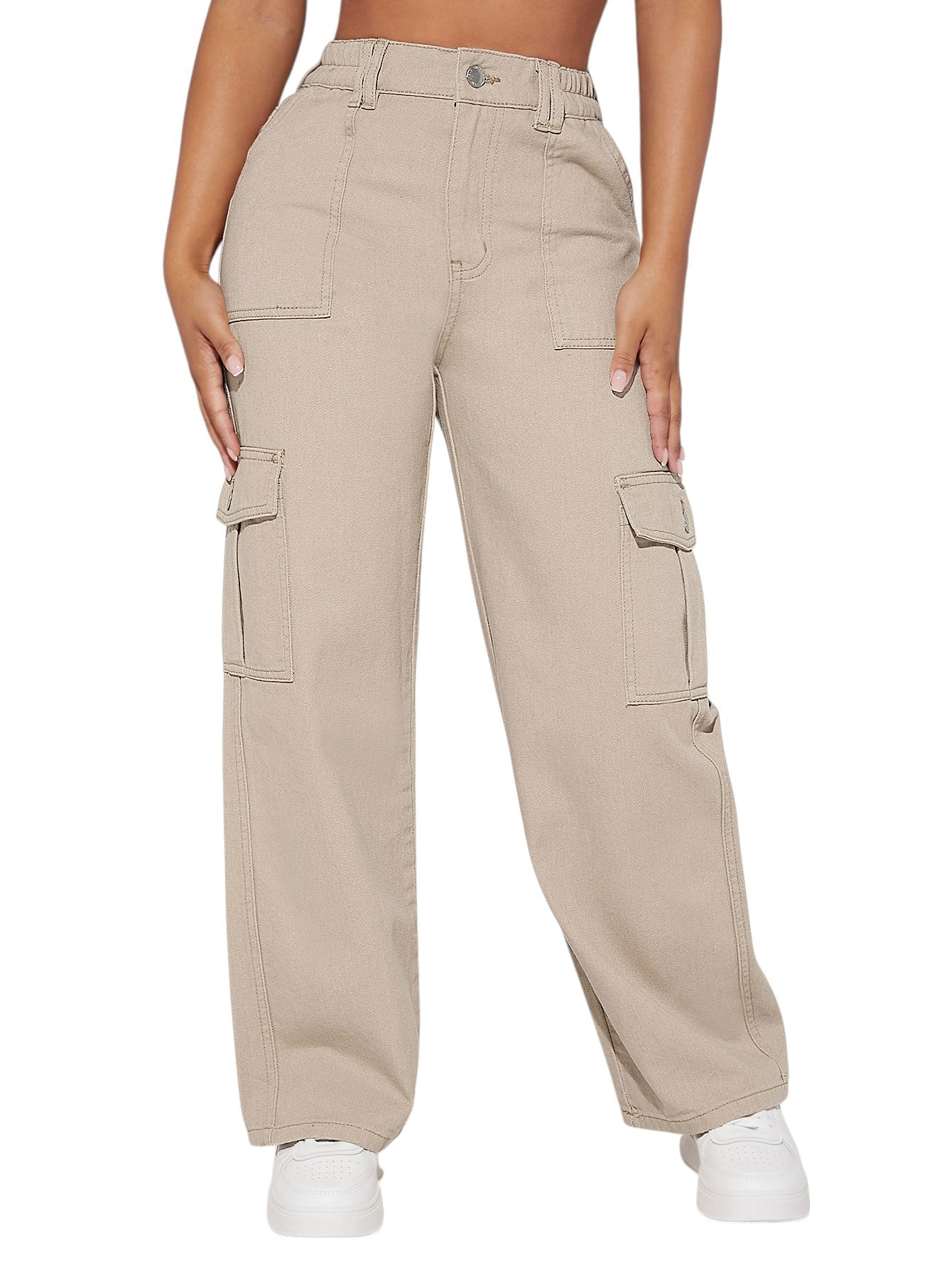 Címke nélküli, bézs, magas derekú, bő szárú cargo nadrág oldalzsebekkel