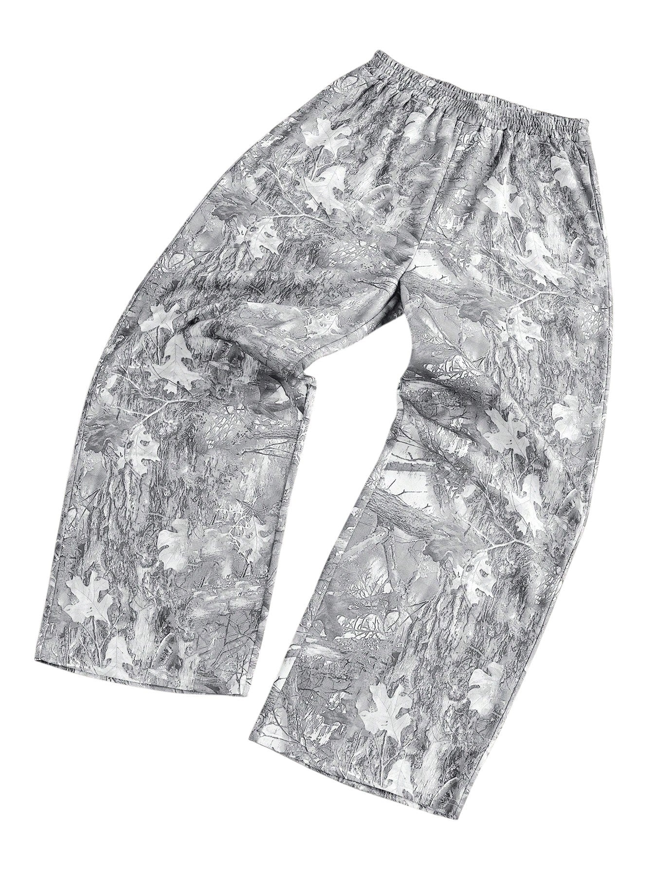 Címke nélküli, szürke alapon fehér és fekete terepmintás, gumis derekú nadrág
