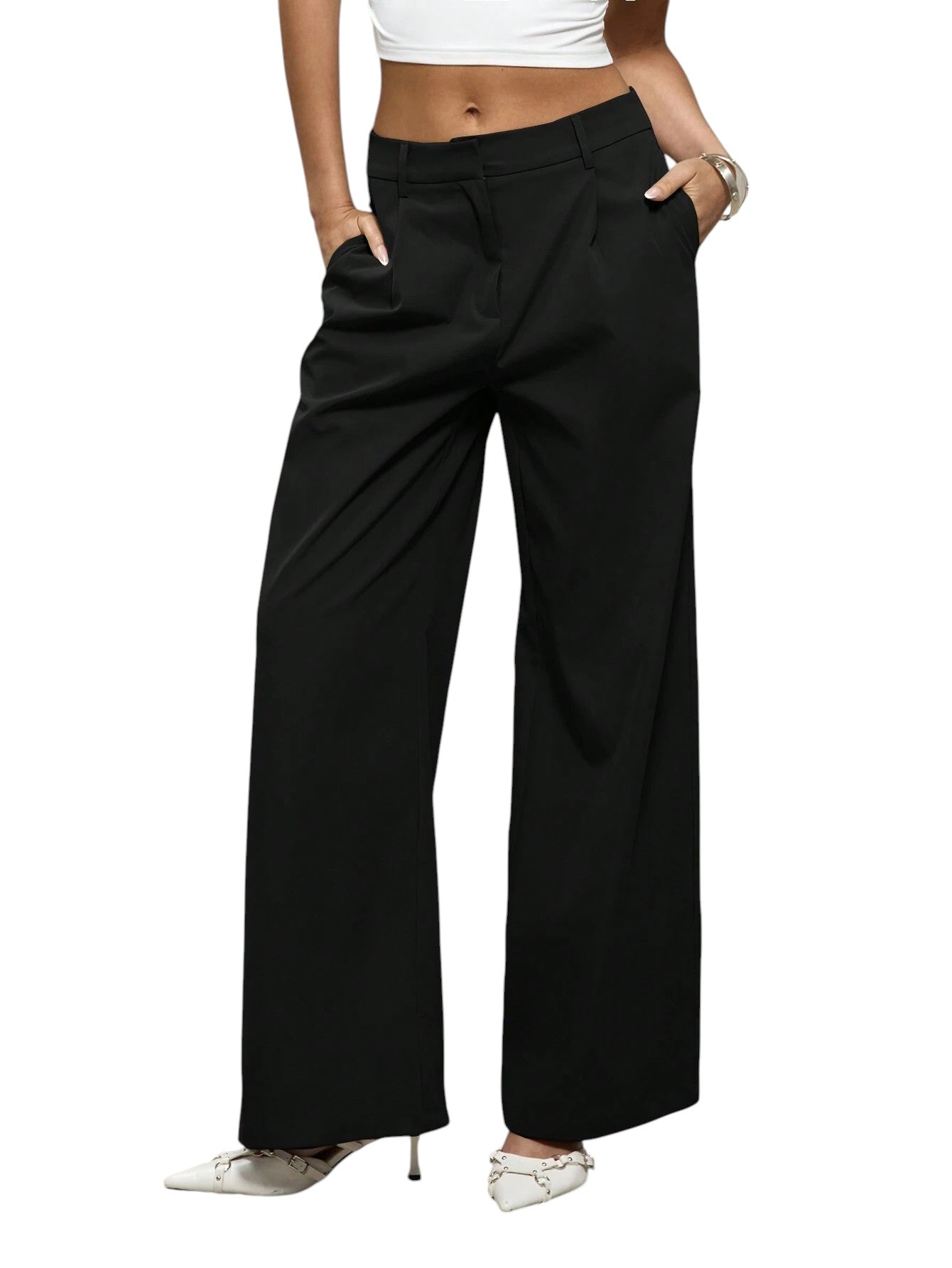 Címke nélküli, fekete, magas derekú, ráncolt elejű, bő szárú nadrág