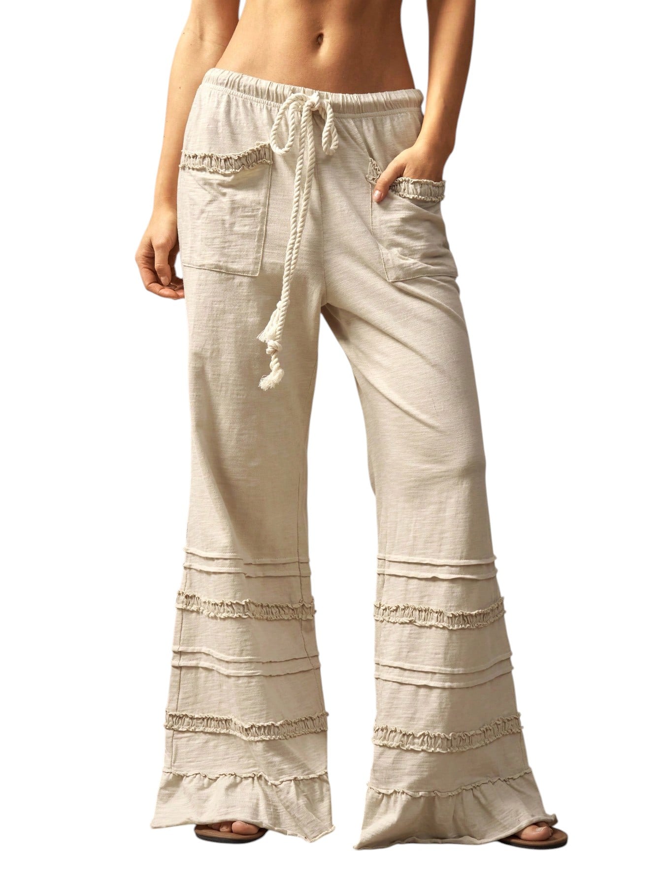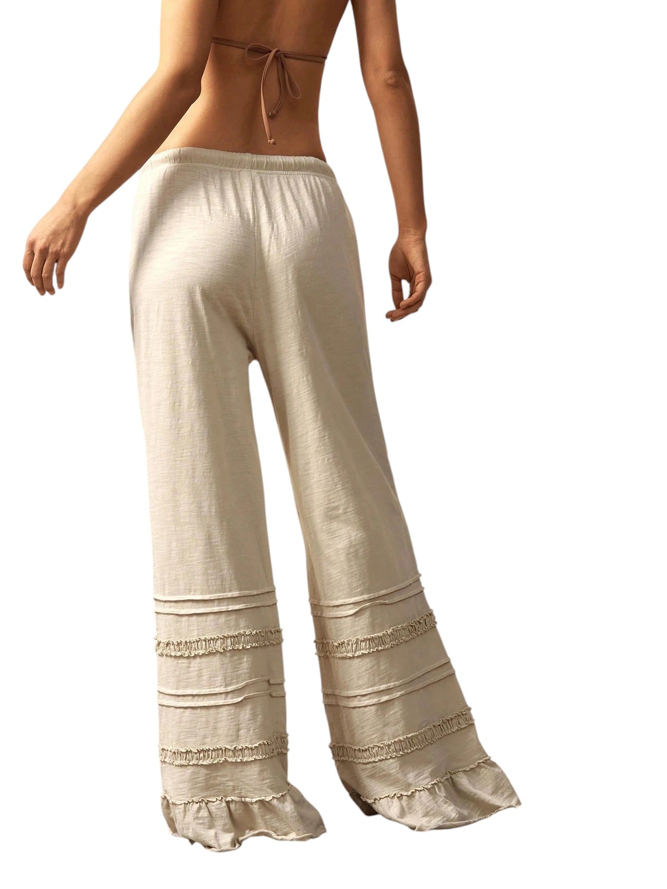 Címke nélküli, bézs, alacsony derekú, húzózsinóros, bő, fodros szárú nadrág