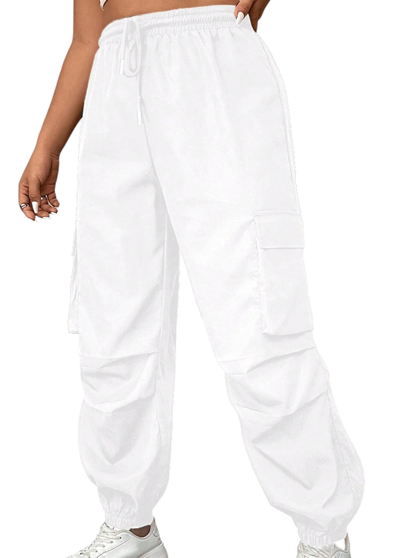 Címke nélküli, fehér, magas derekú, húzózsinóros derekú, bő szárú cargo nadrág oldalzsebekkel