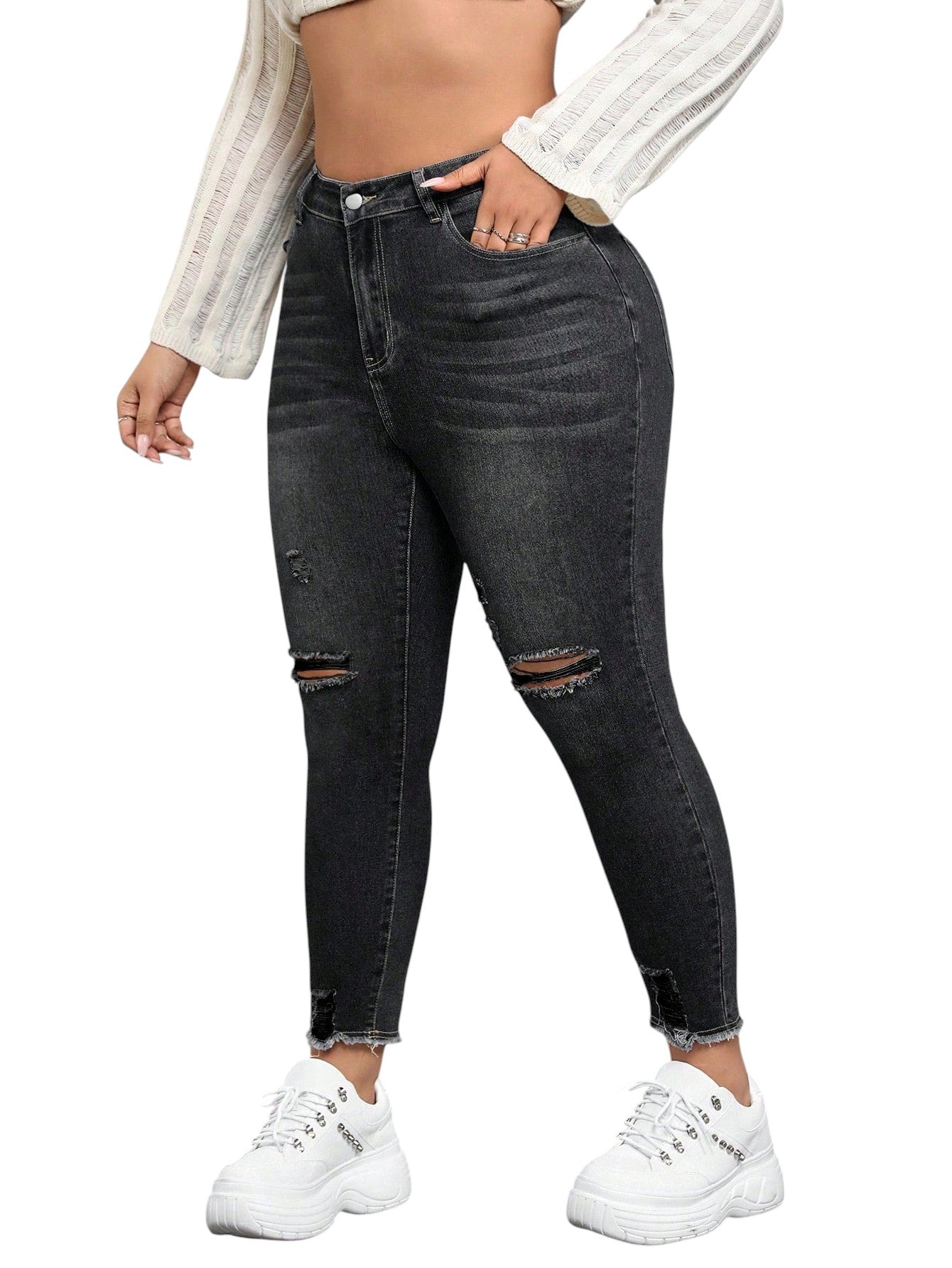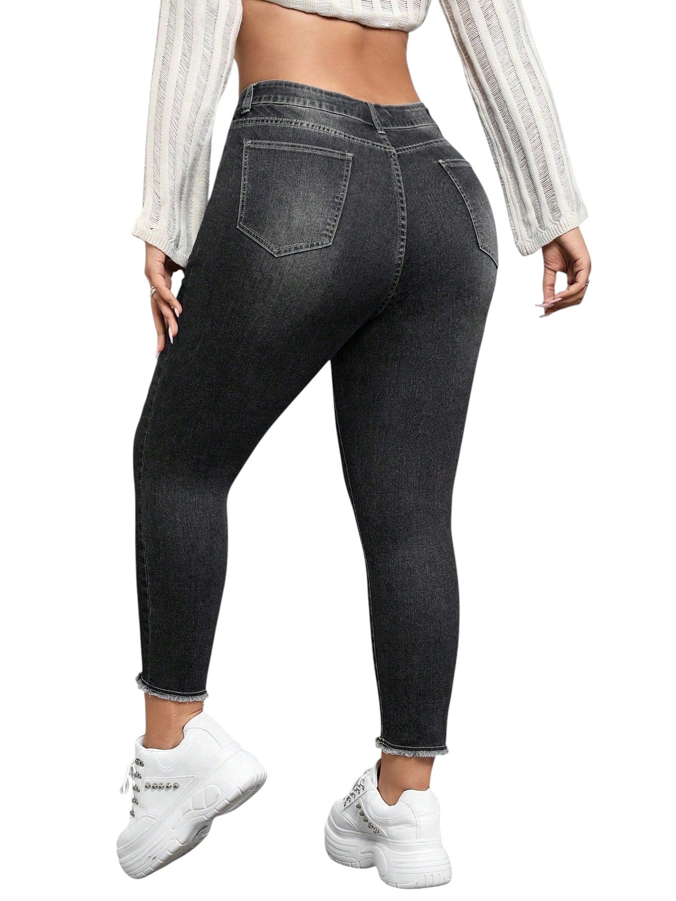 Címke nélküli, sötétszürke, magas derekú, szaggatott és rojtos szegélyű, testhezálló farmer