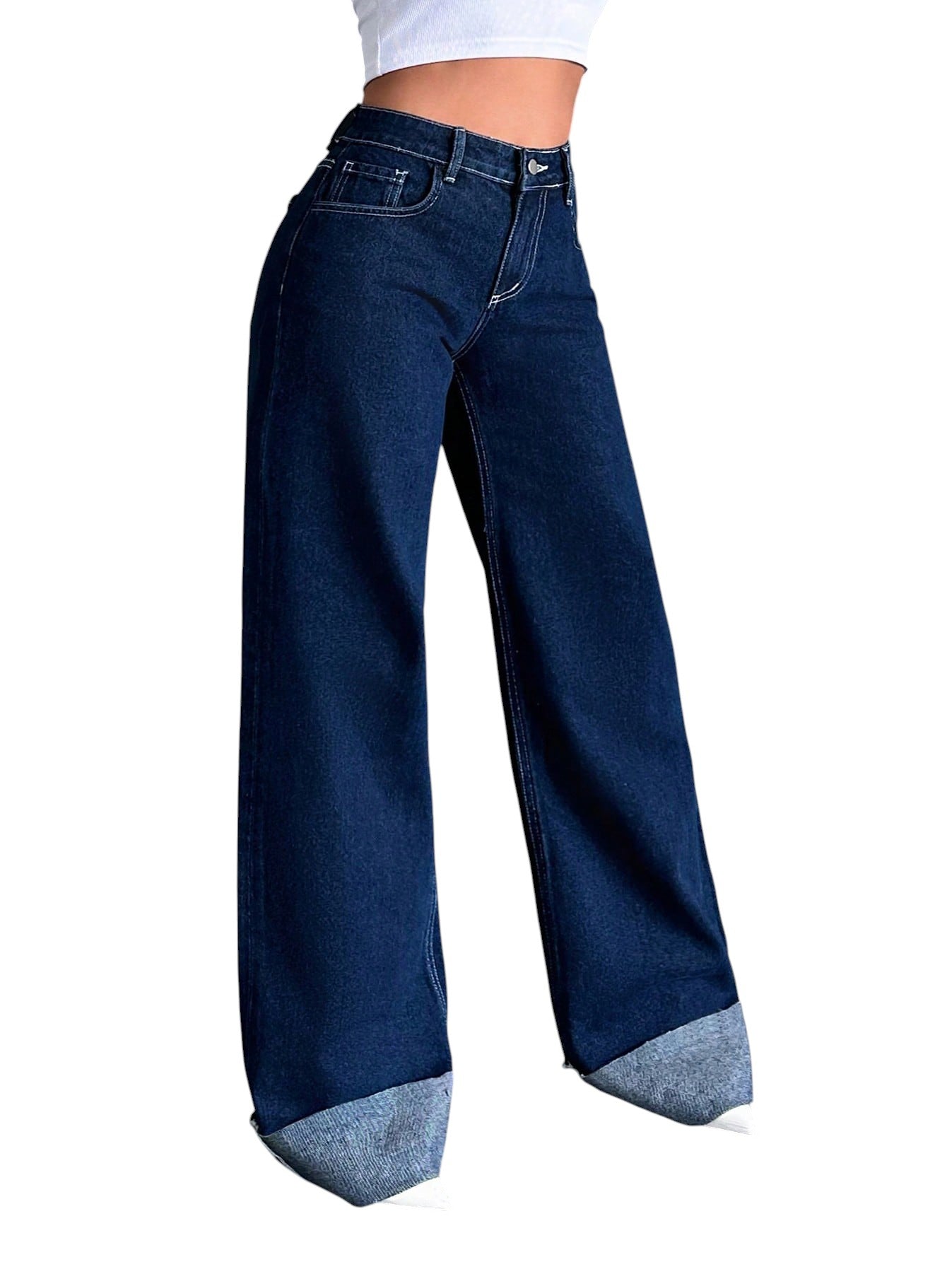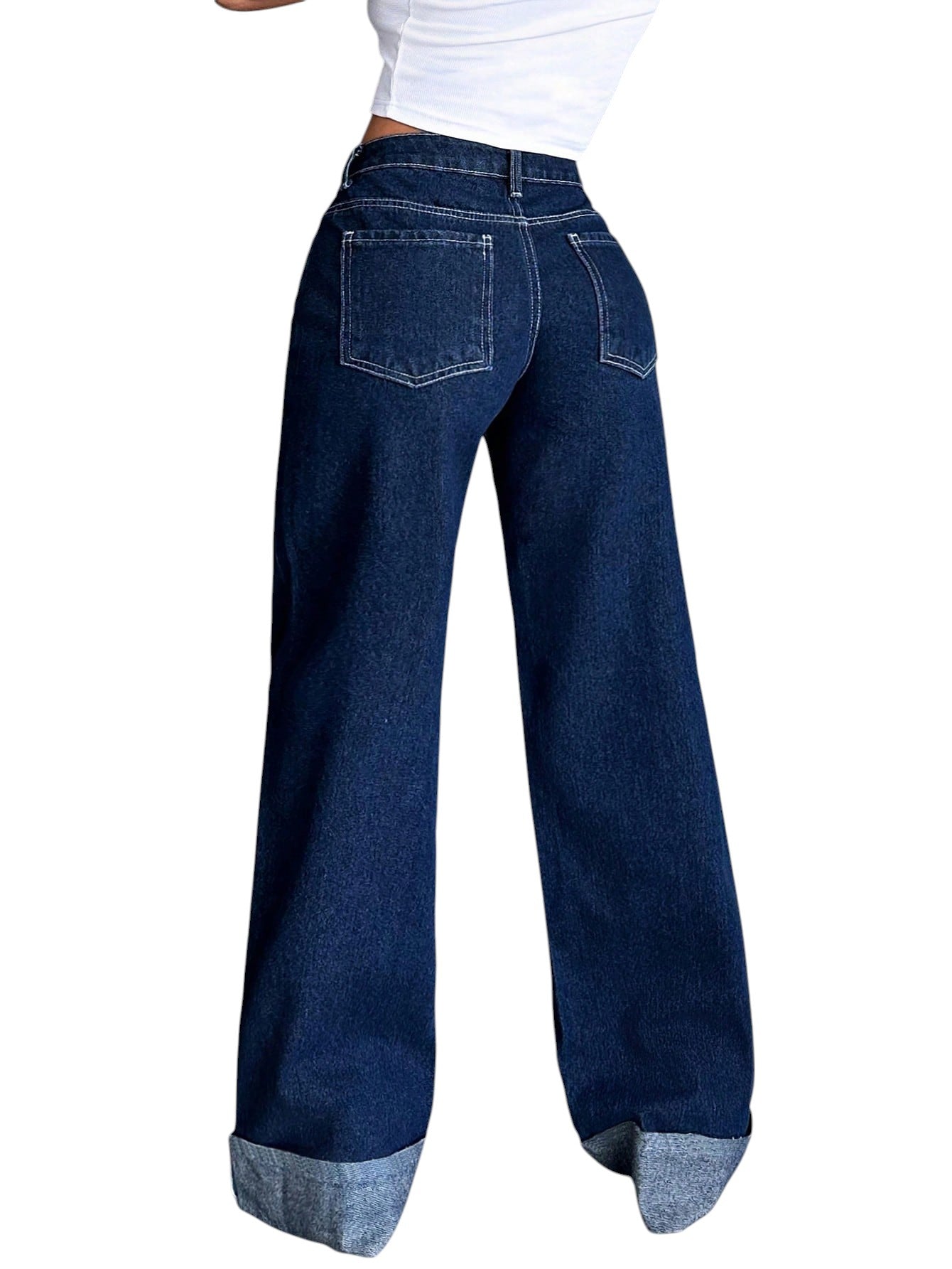 Címke nélküli, sötétkék, széles szárú, felhajtott szélű farmer nadrág.