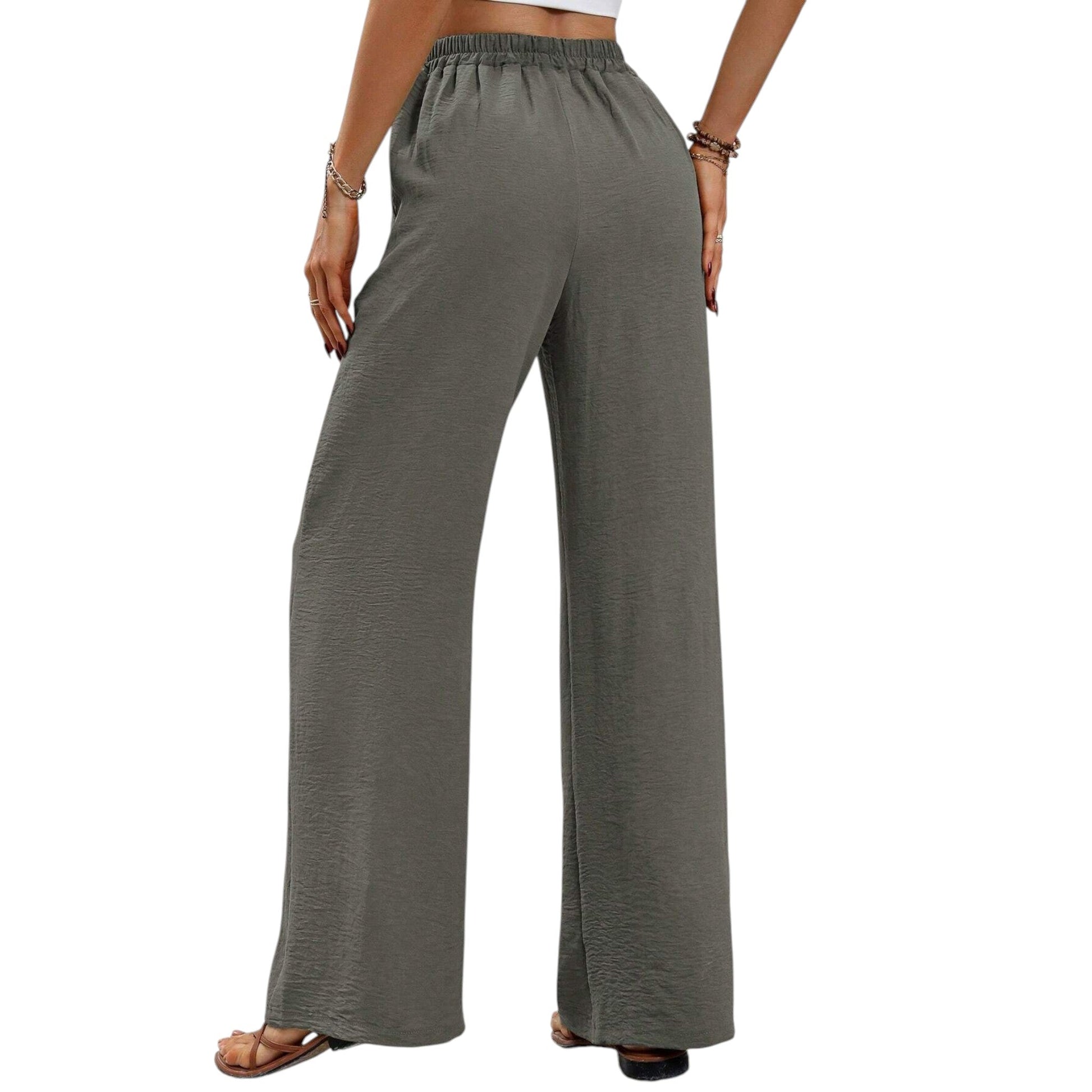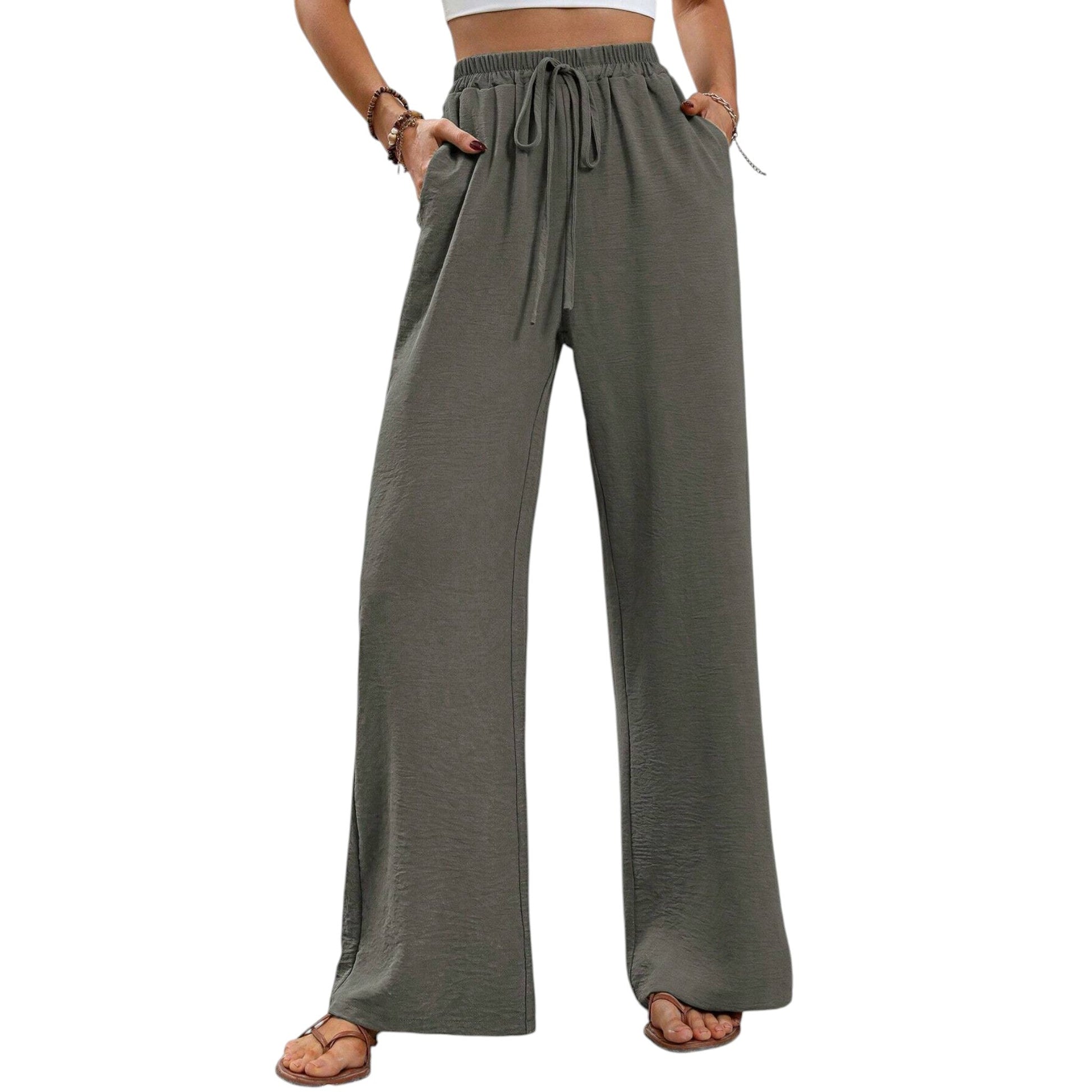Címke nélküli, szürke, magas derekú, húzózsinóros, bő szárú nadrág, oldalt zsebekkel.