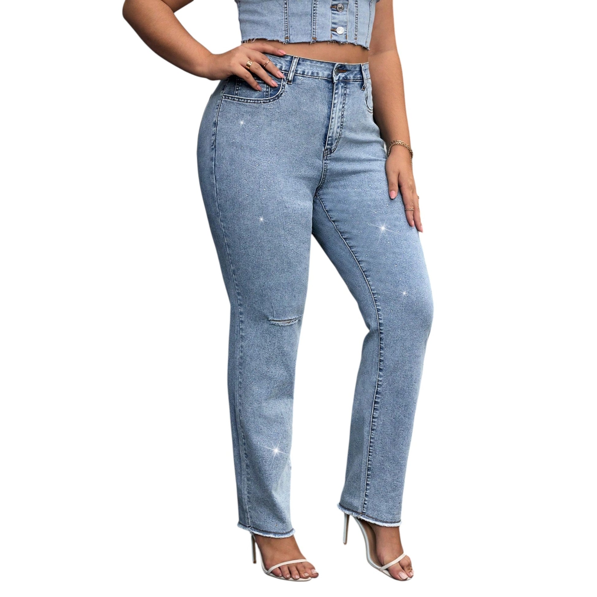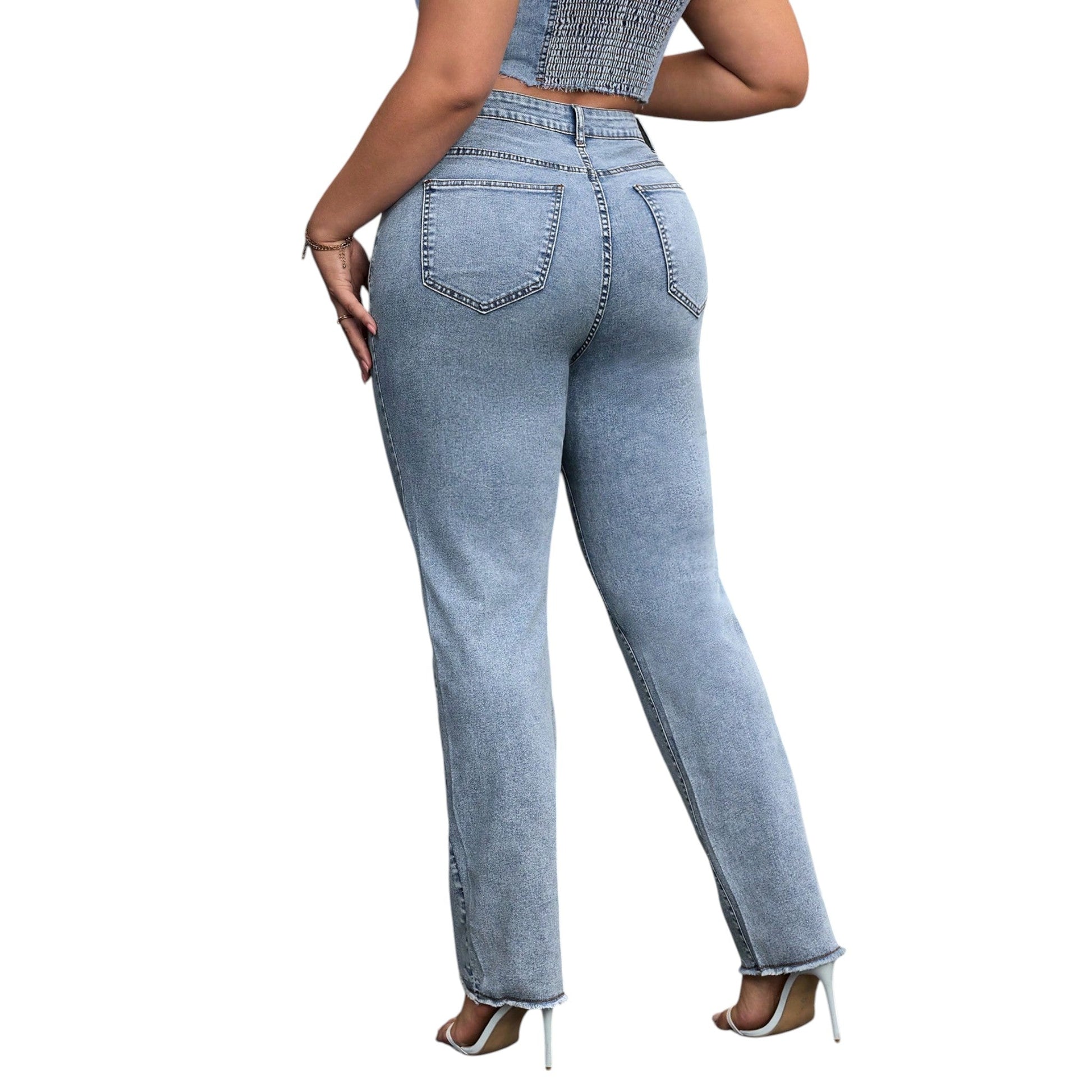 Címke nélküli, világoskék, magas derekú, egyenes szárú, koptatott hatású, enyhén szaggatott.