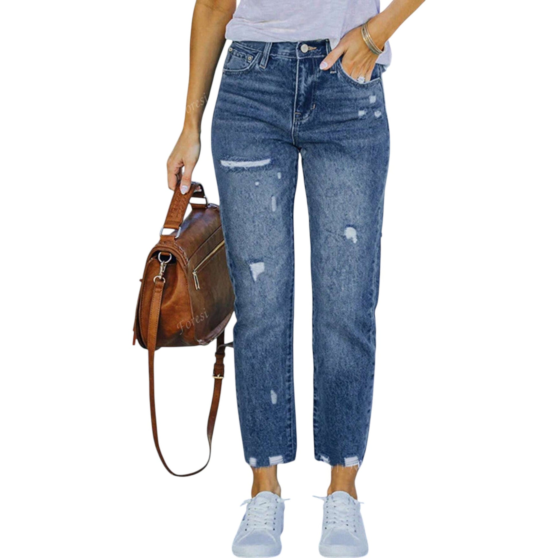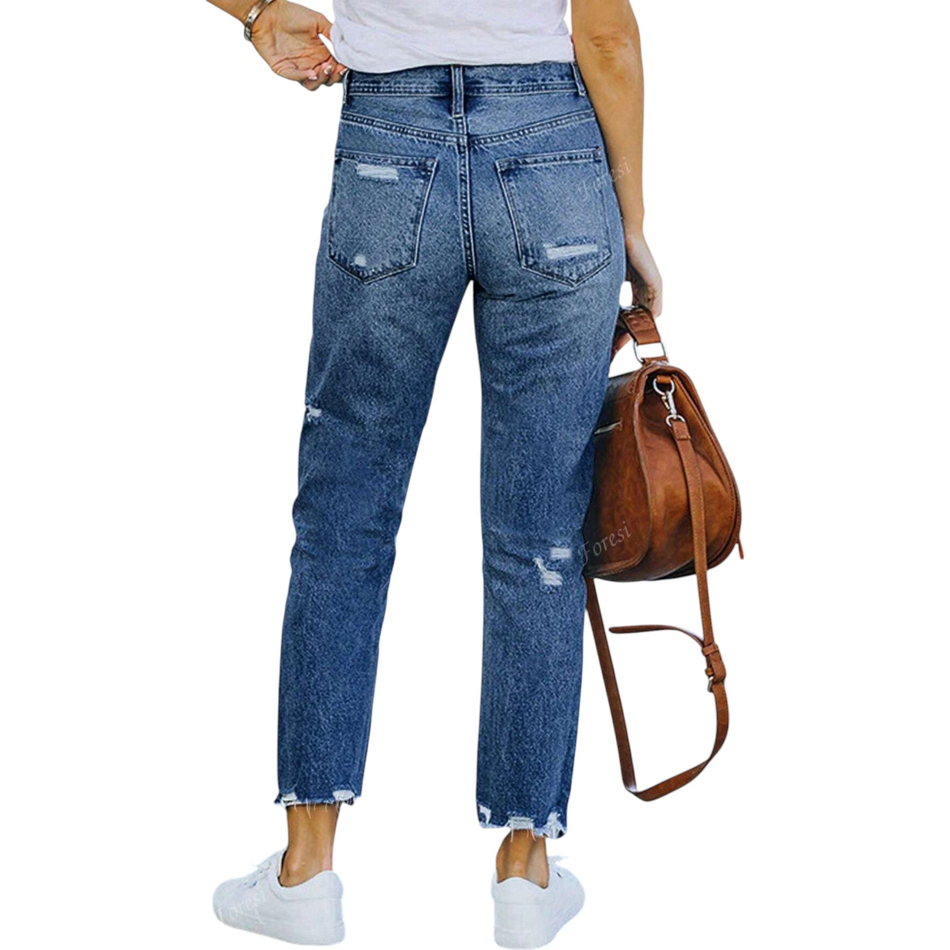Címke nélküli, kék, szaggatott, egyenes szabású farmer nadrág.