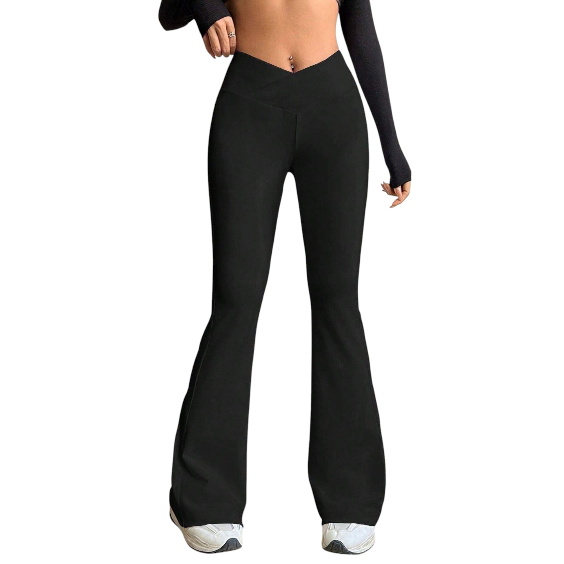 Címke nélküli, fekete, harangszárú leggings V-alakú derékrésszel.
