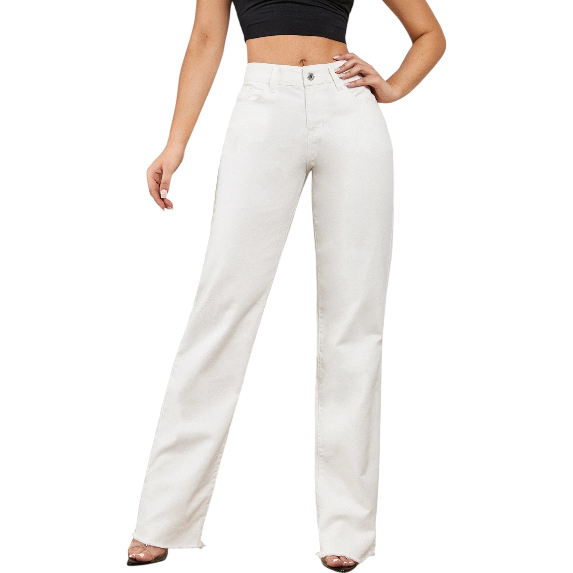 Címke nélküli, fehér színű, egyenes szárú farmer nadrág, rojtos aljjal. Klasszikus öt zsebes kialakítással. Kényelmes és divatos viselet a mindennapokra.