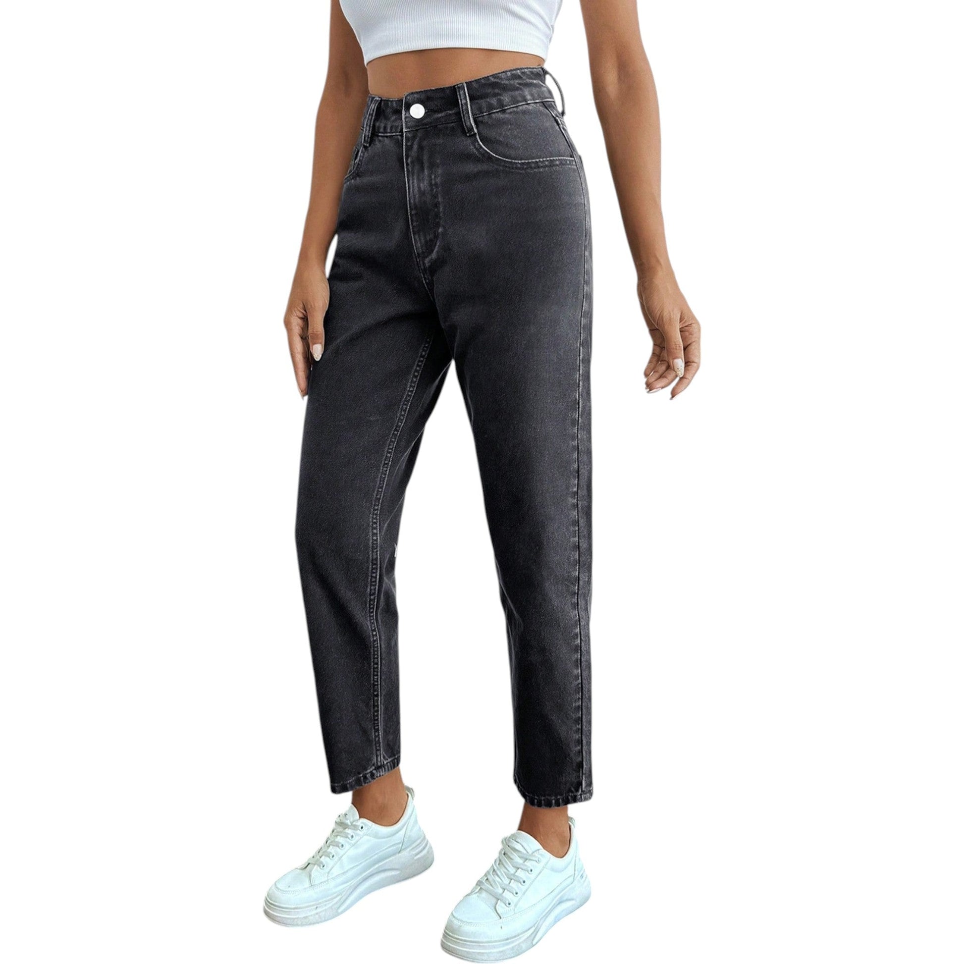 Címke nélküli, fekete, magas derekú, egyenes szárú, mom fit farmer nadrág.