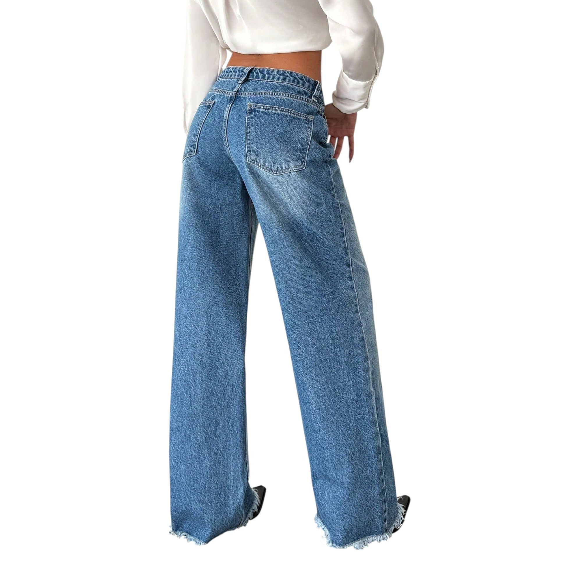 Címke nélküli, világoskék, alacsony derekú, bő szárú, rojtos szélű farmer.