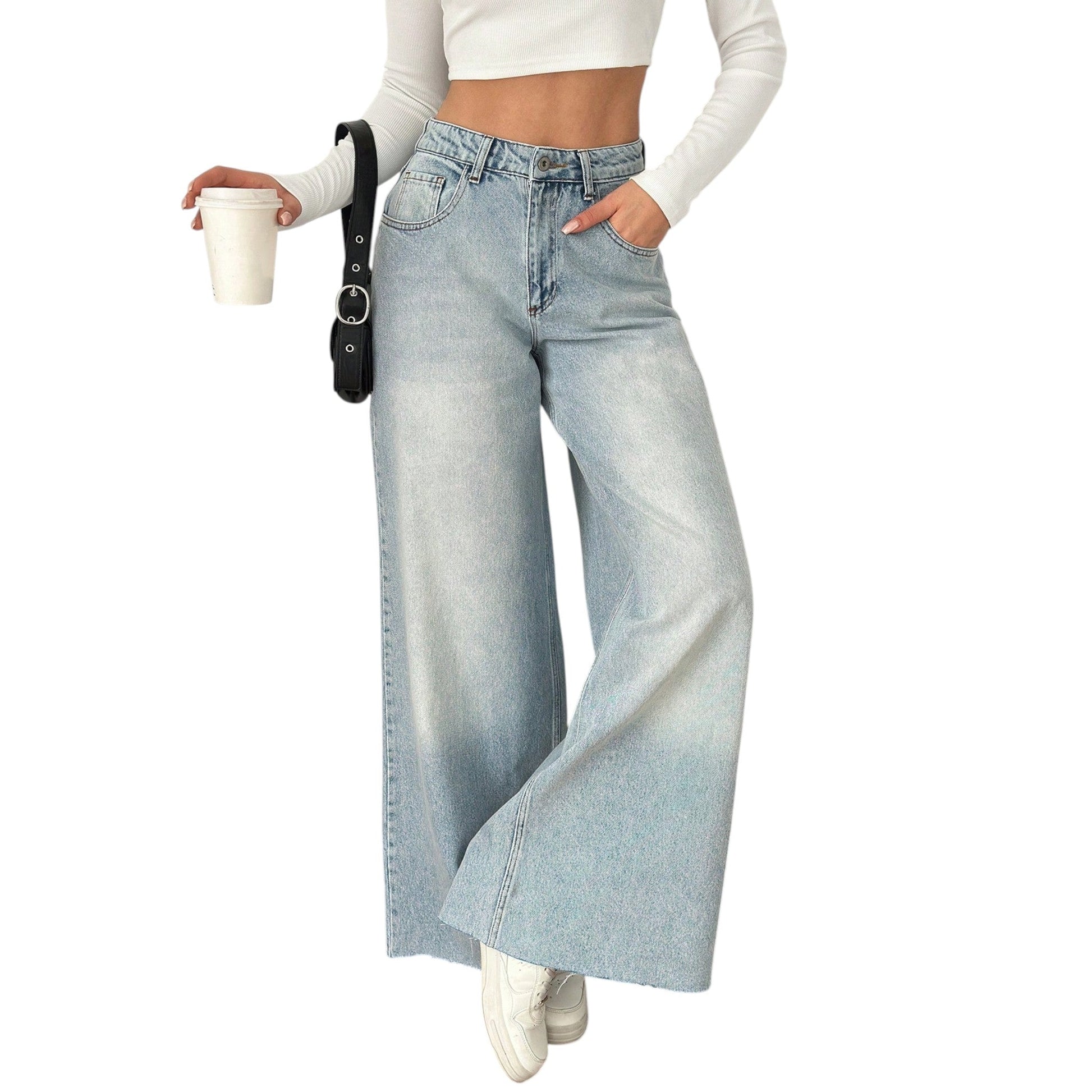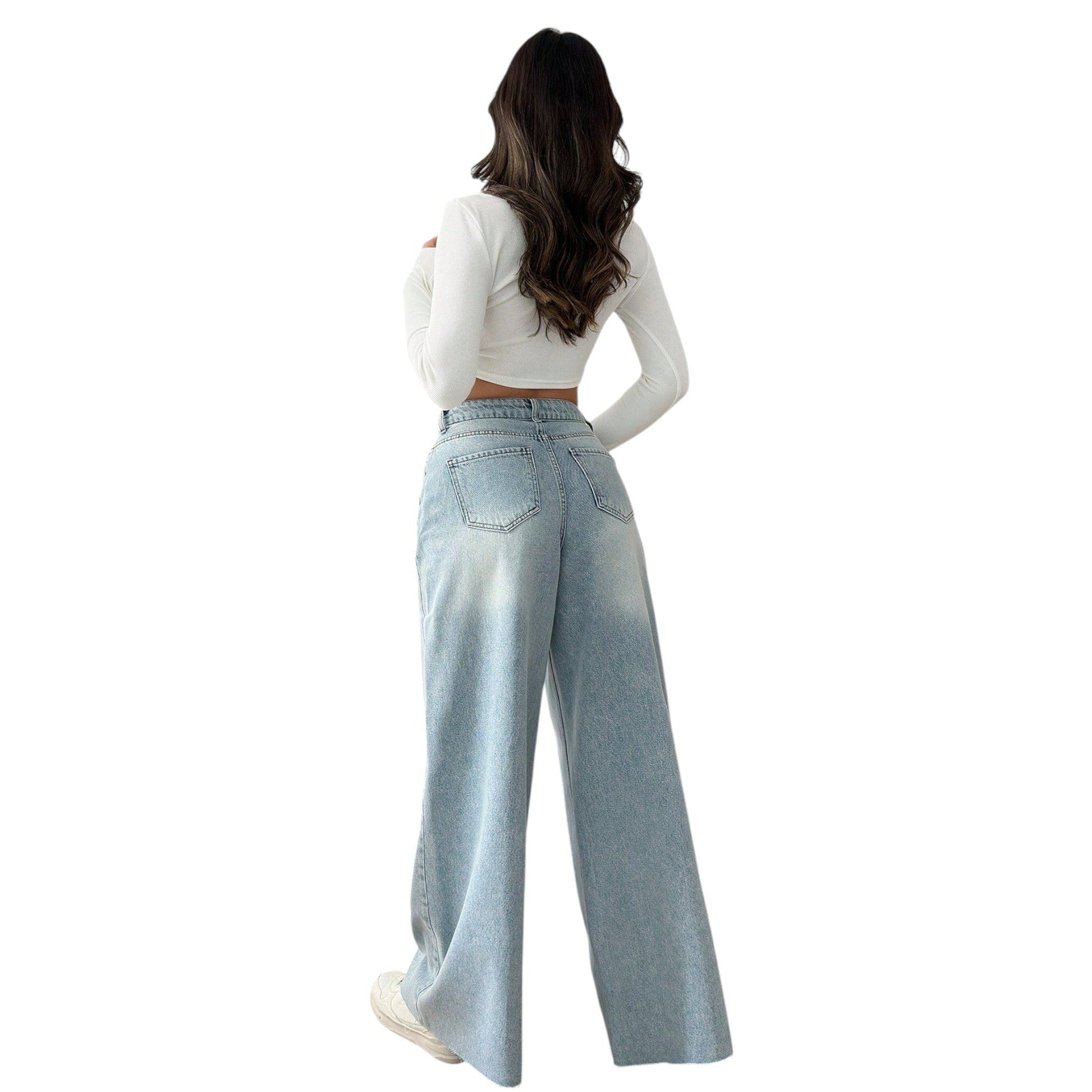 Címke nélküli, világoskék, magas derekú, bő szárú, hosszú farmer.