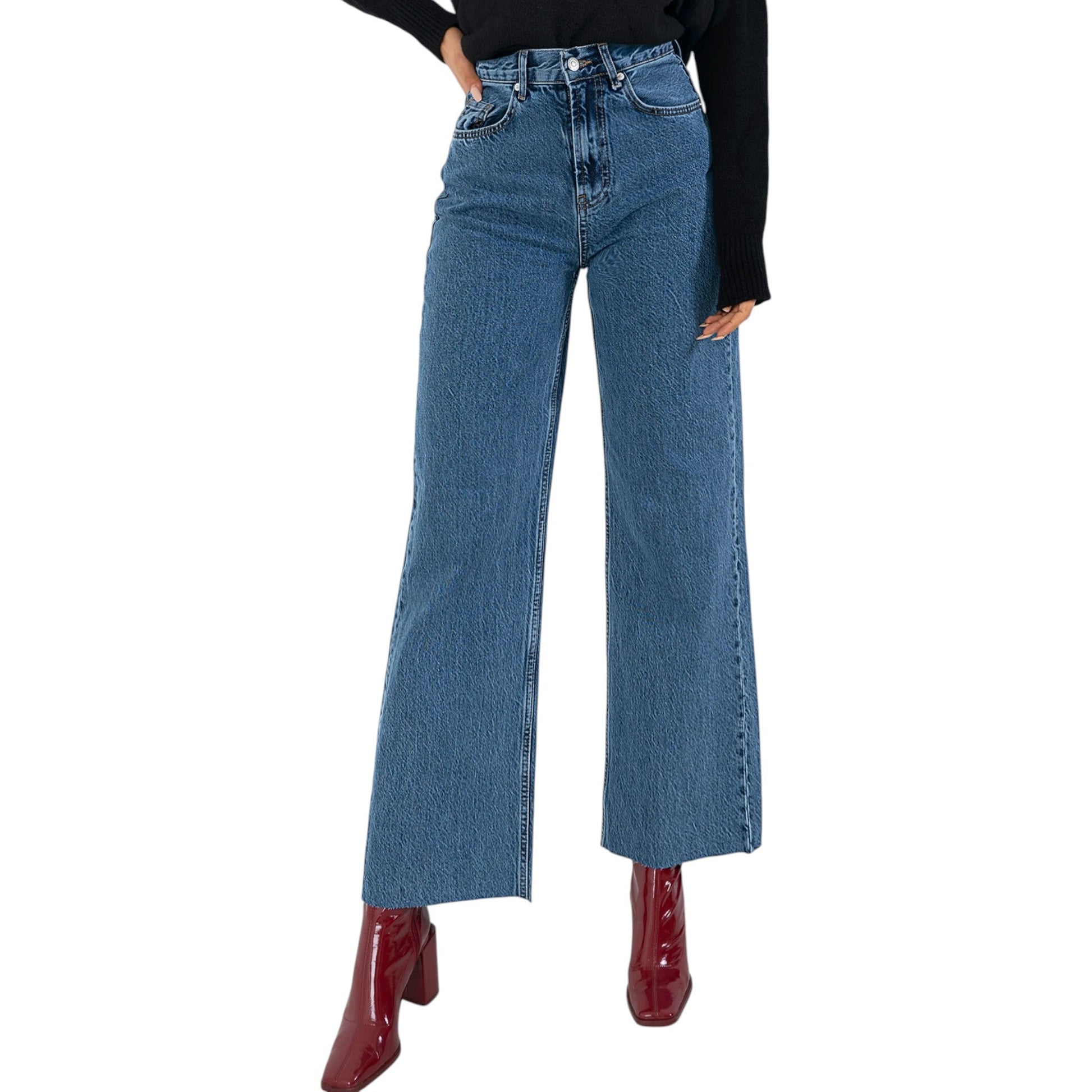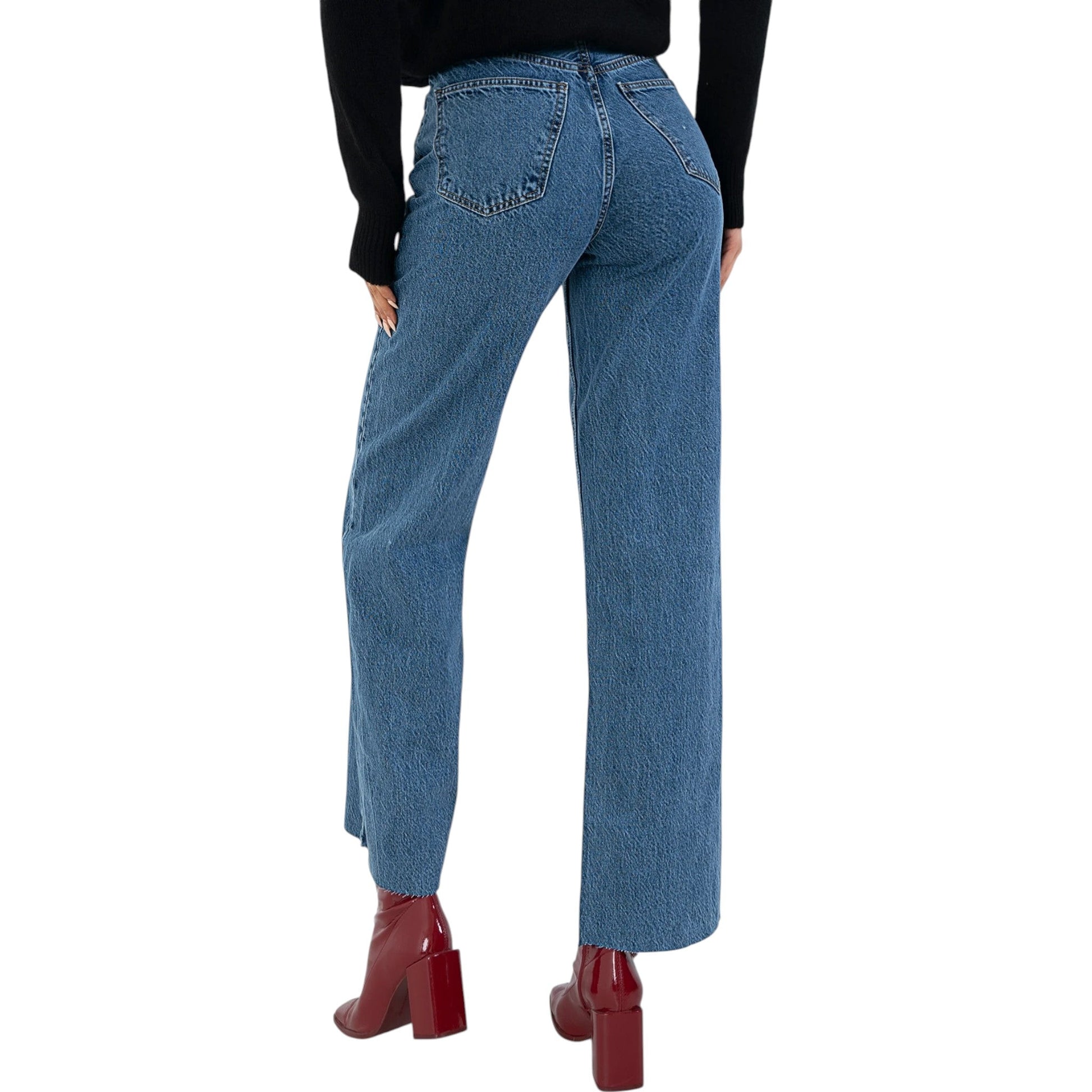 Címke nélküli, kék színű, magas derekú, egyenes szárú farmernadrág. Klasszikus öt zsebes kialakítással és rojtos végekkel. Kényelmes és divatos viselet a mindennapokra.