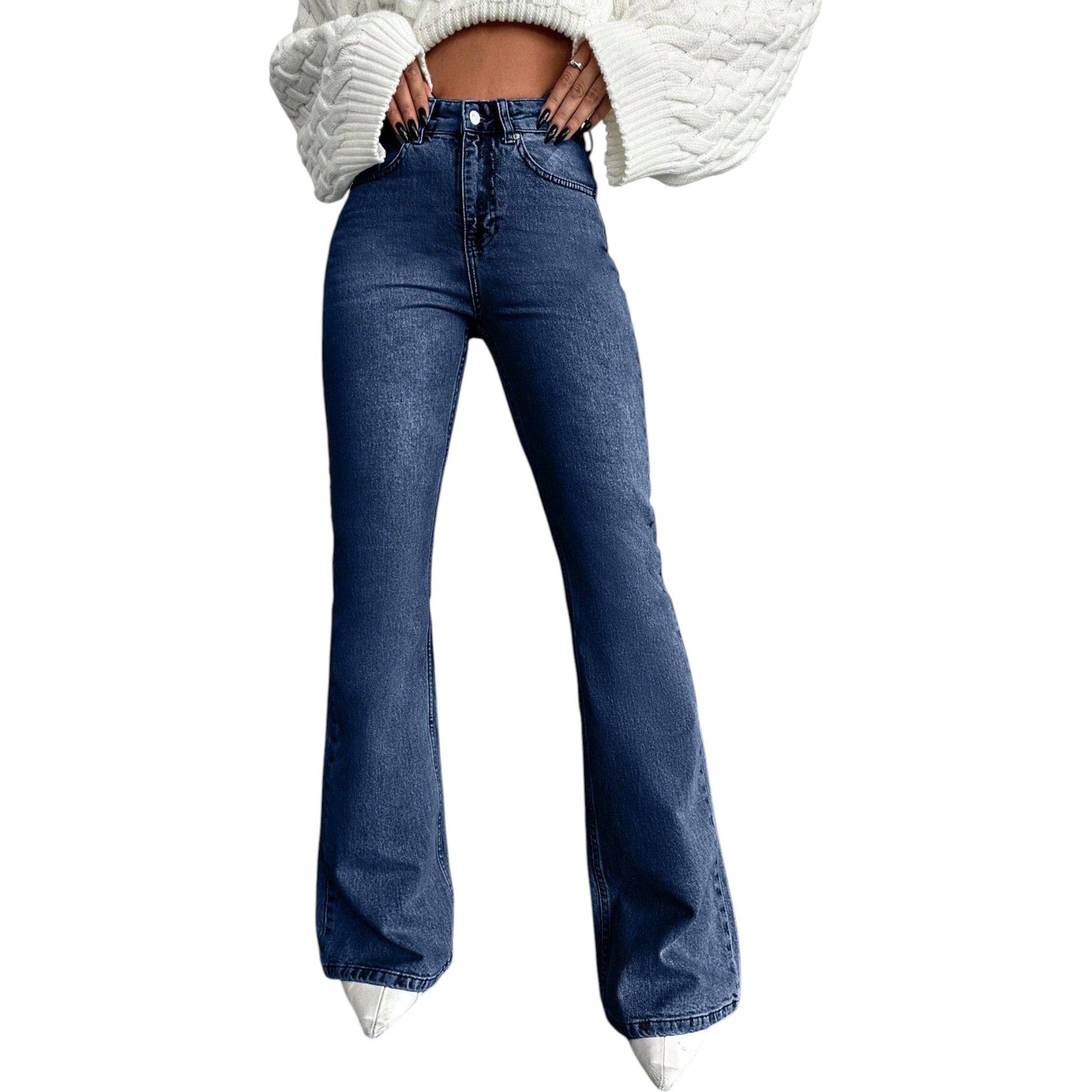 Címke nélküli, kék, magas derekú, trapéz szárú farmer nadrág.