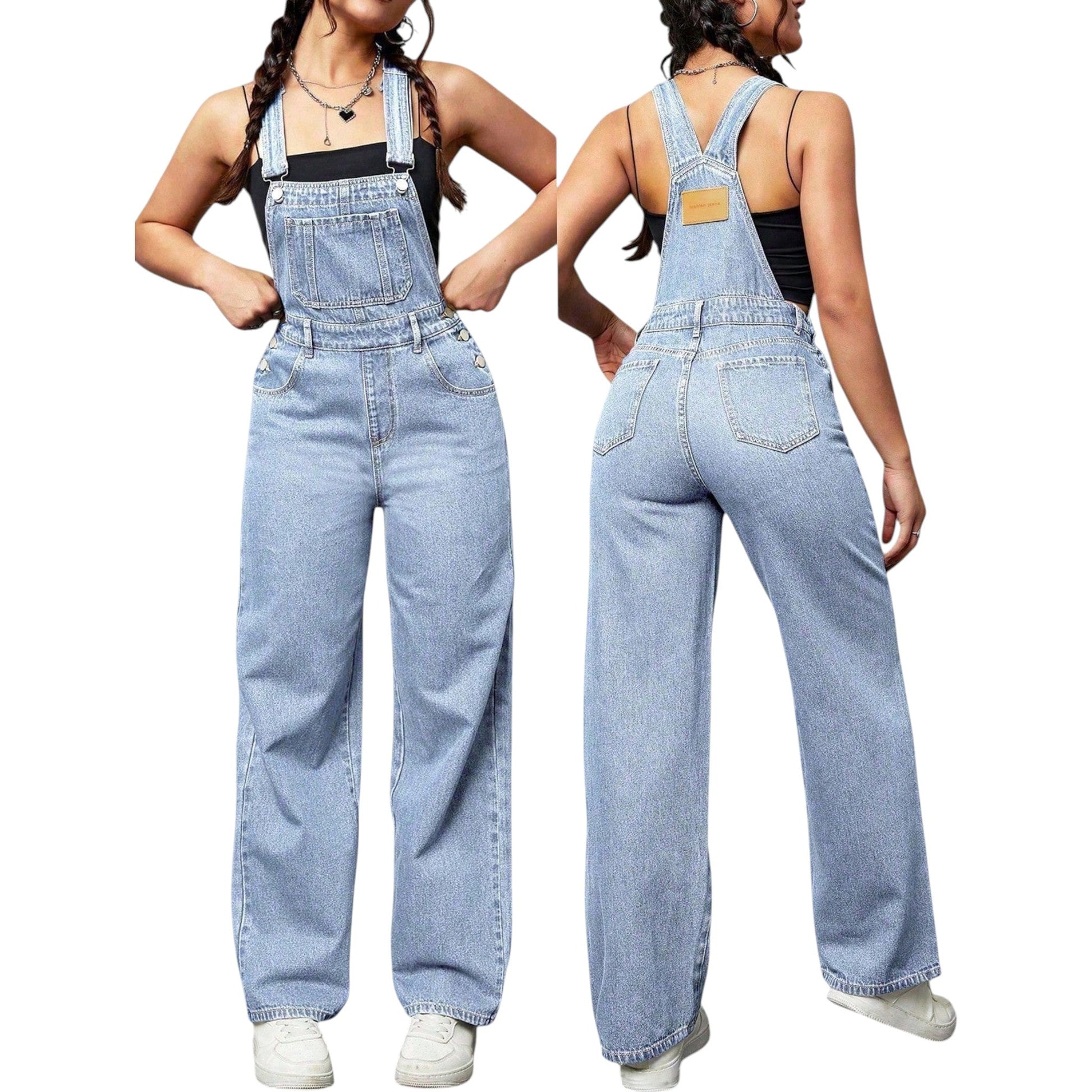 Címke nélküli, világoskék, laza szabású, állítható pántos, elöl zsebes farmer overál.