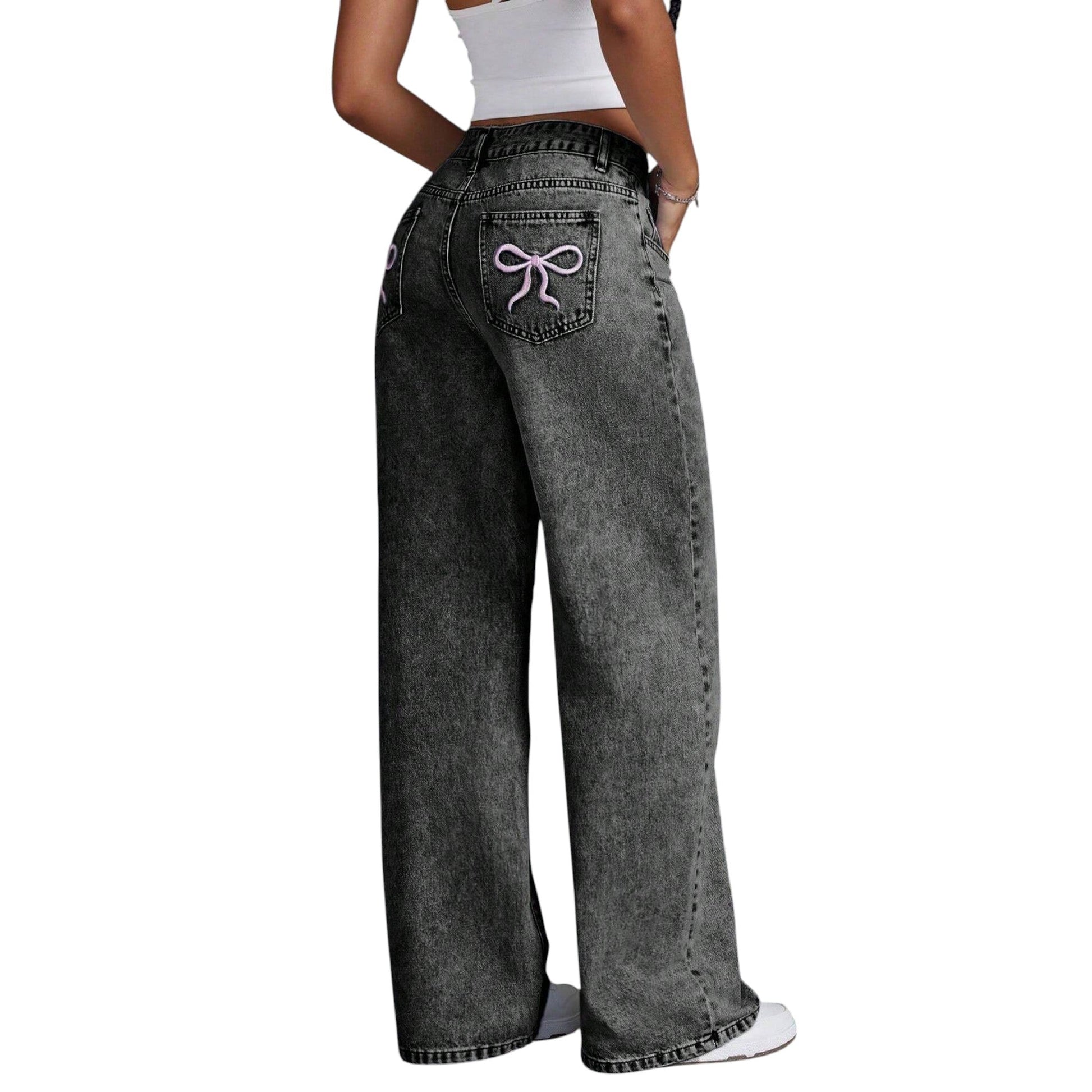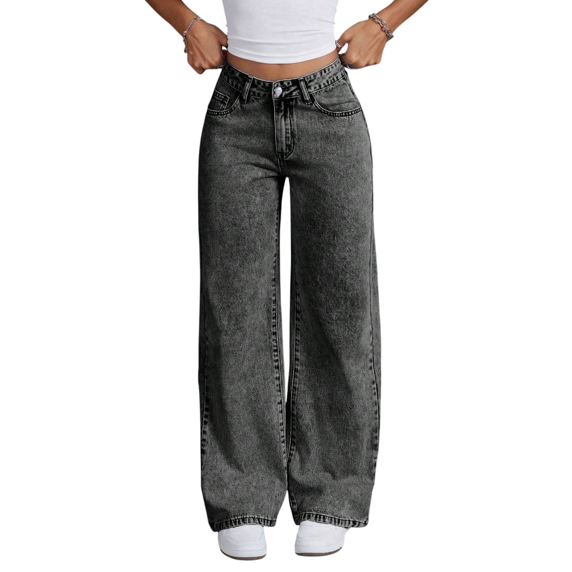 Címke nélküli, szürke, magas derekú, bő szárú farmer nadrág.