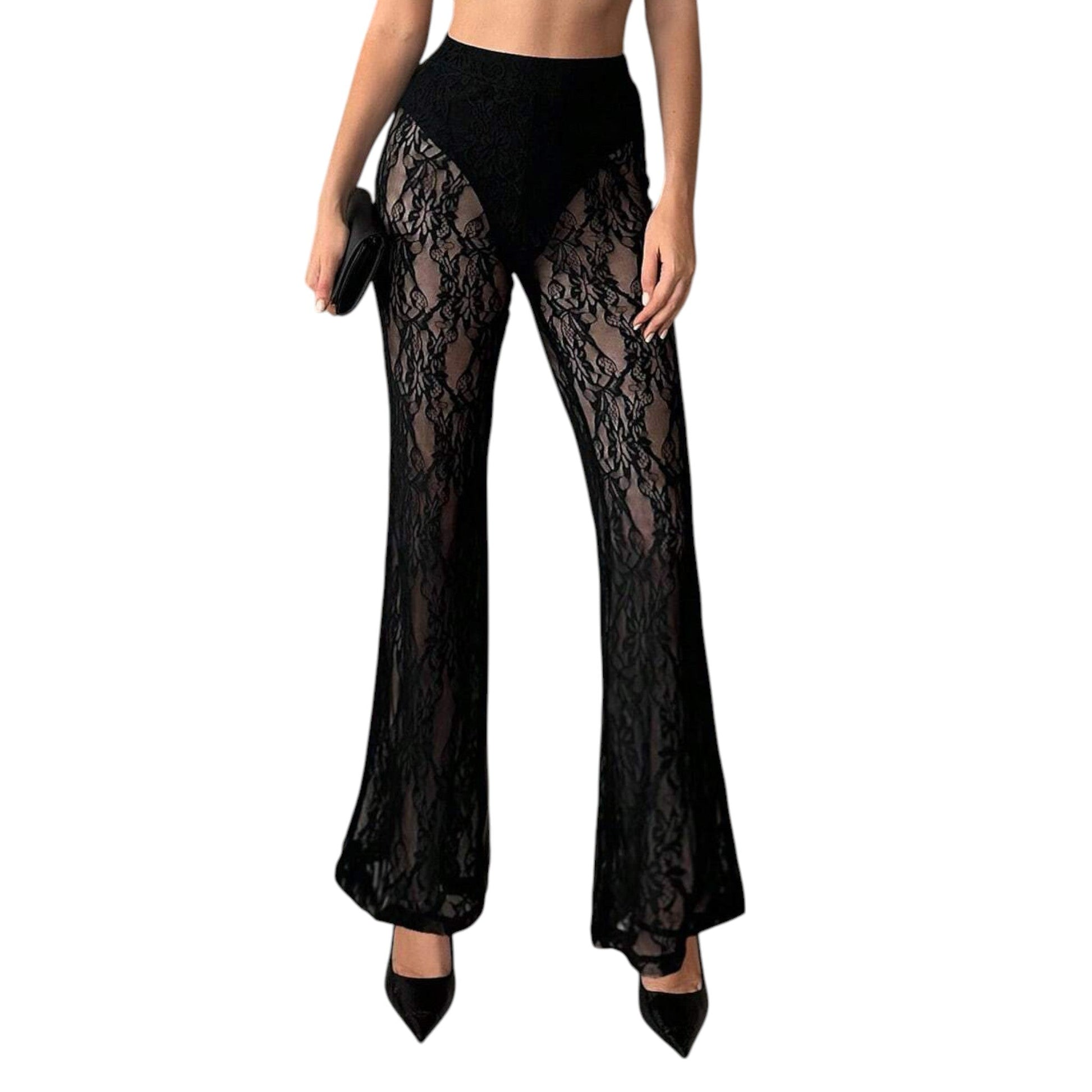 Címke nélküli, fekete, áttetsző csipke anyagú, harangszárú nadrág.