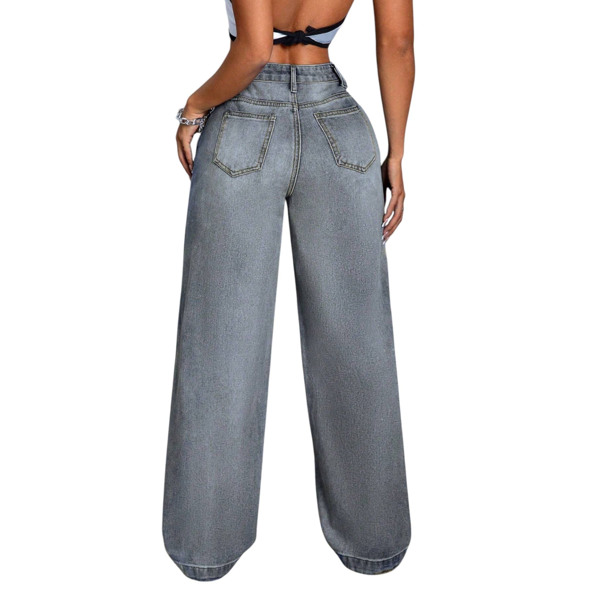 Címke nélküli, kék, magas derekú, bő szárú farmer, oldalt zsebekkel.