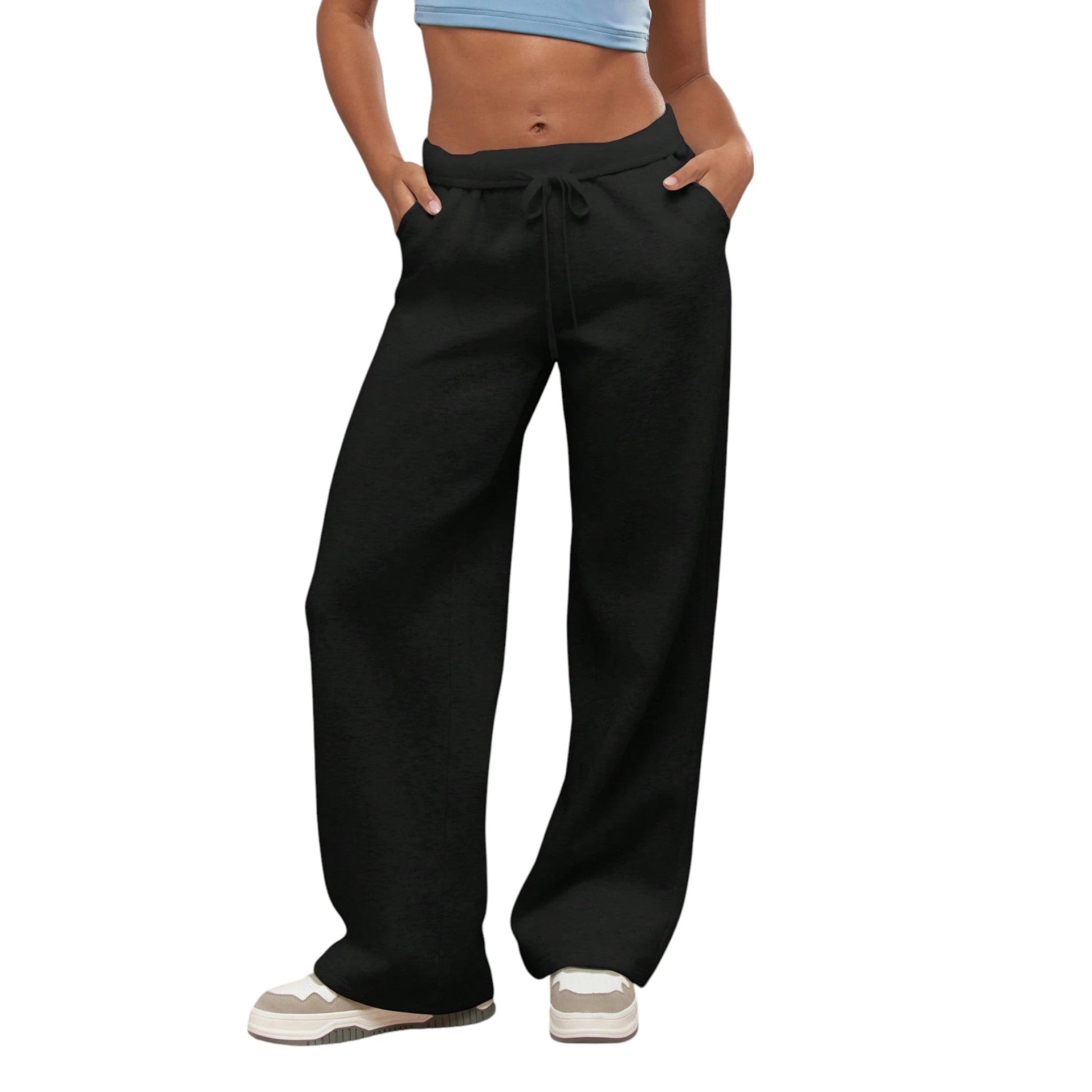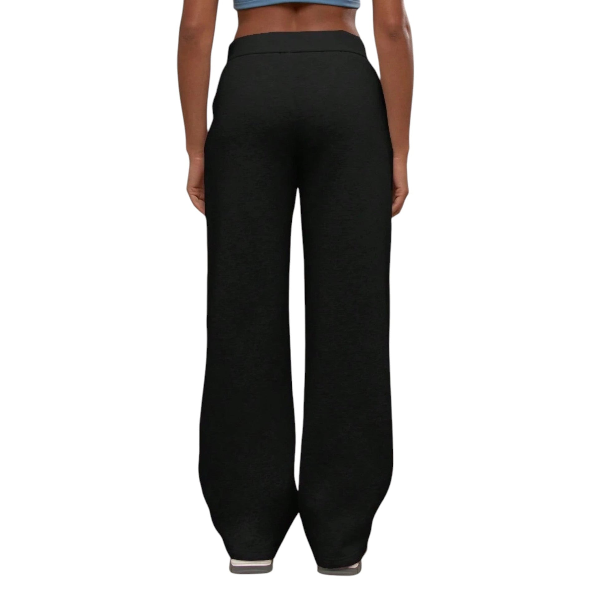 Címke nélküli, fekete, bő szárú, húzott derekú melegítőnadrág, oldalt zsebekkel.