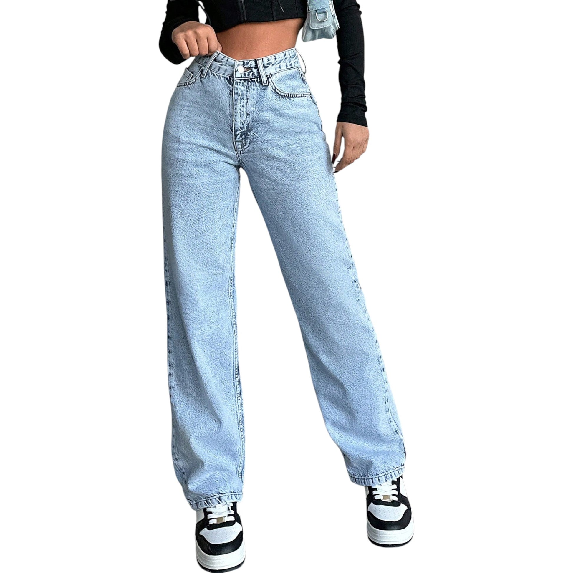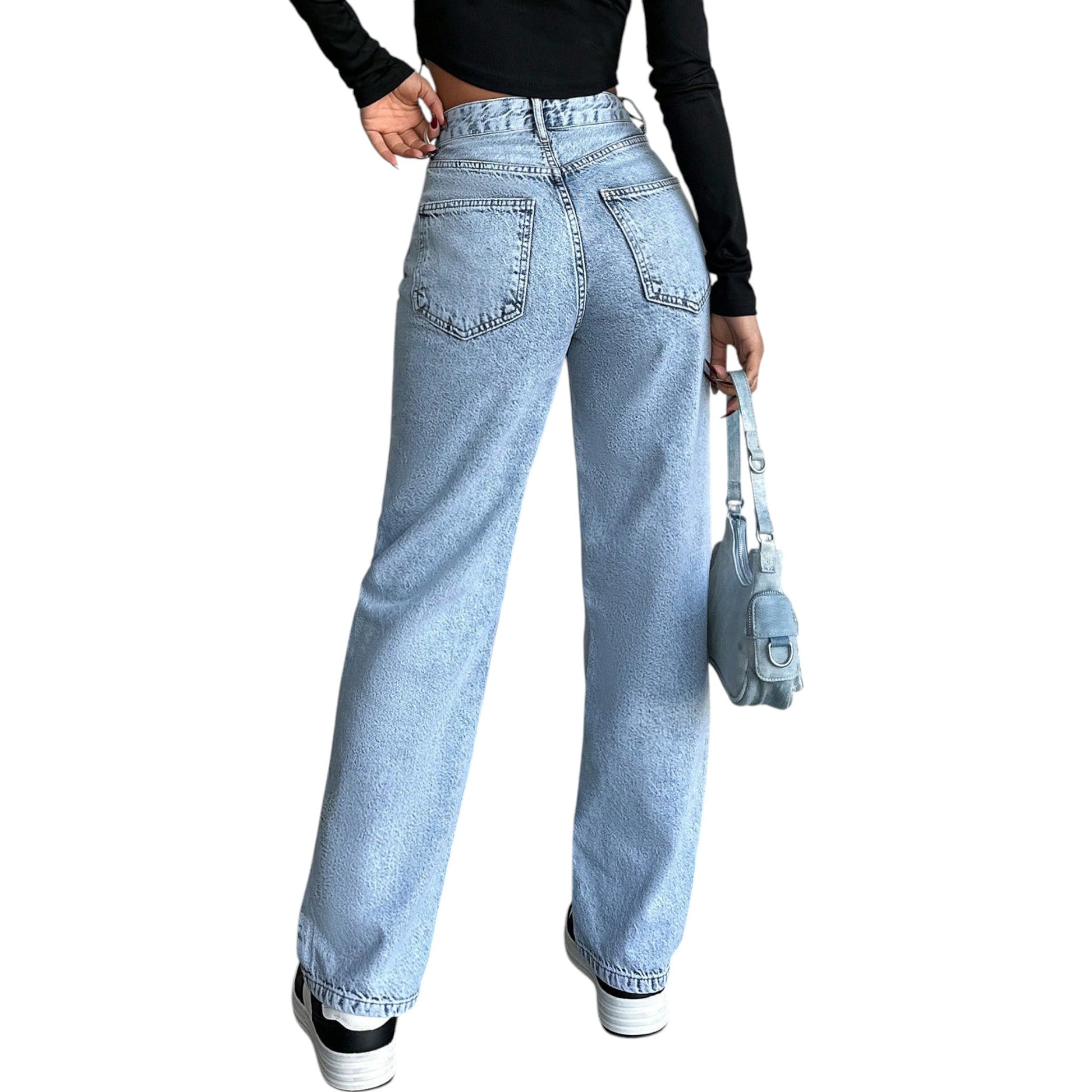 Címke nélküli, világoskék, magas derekú, egyenes szárú farmer nadrág.