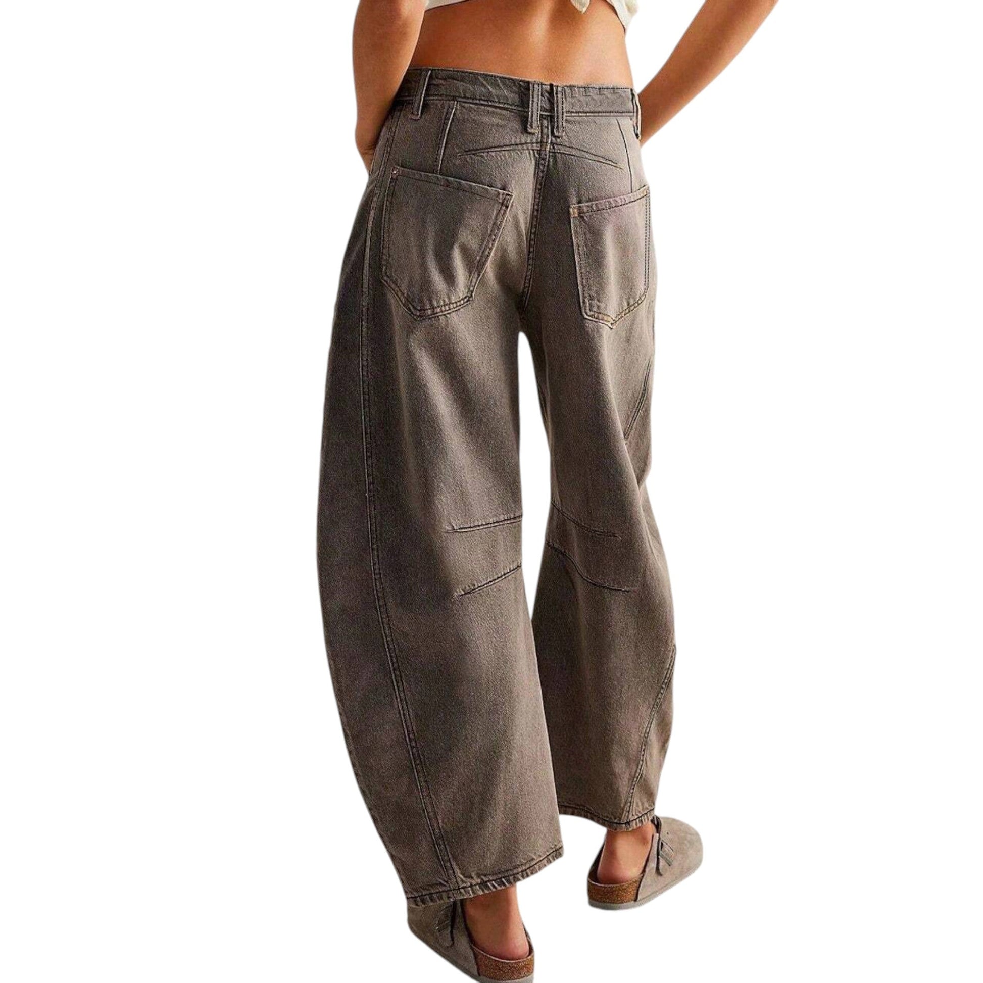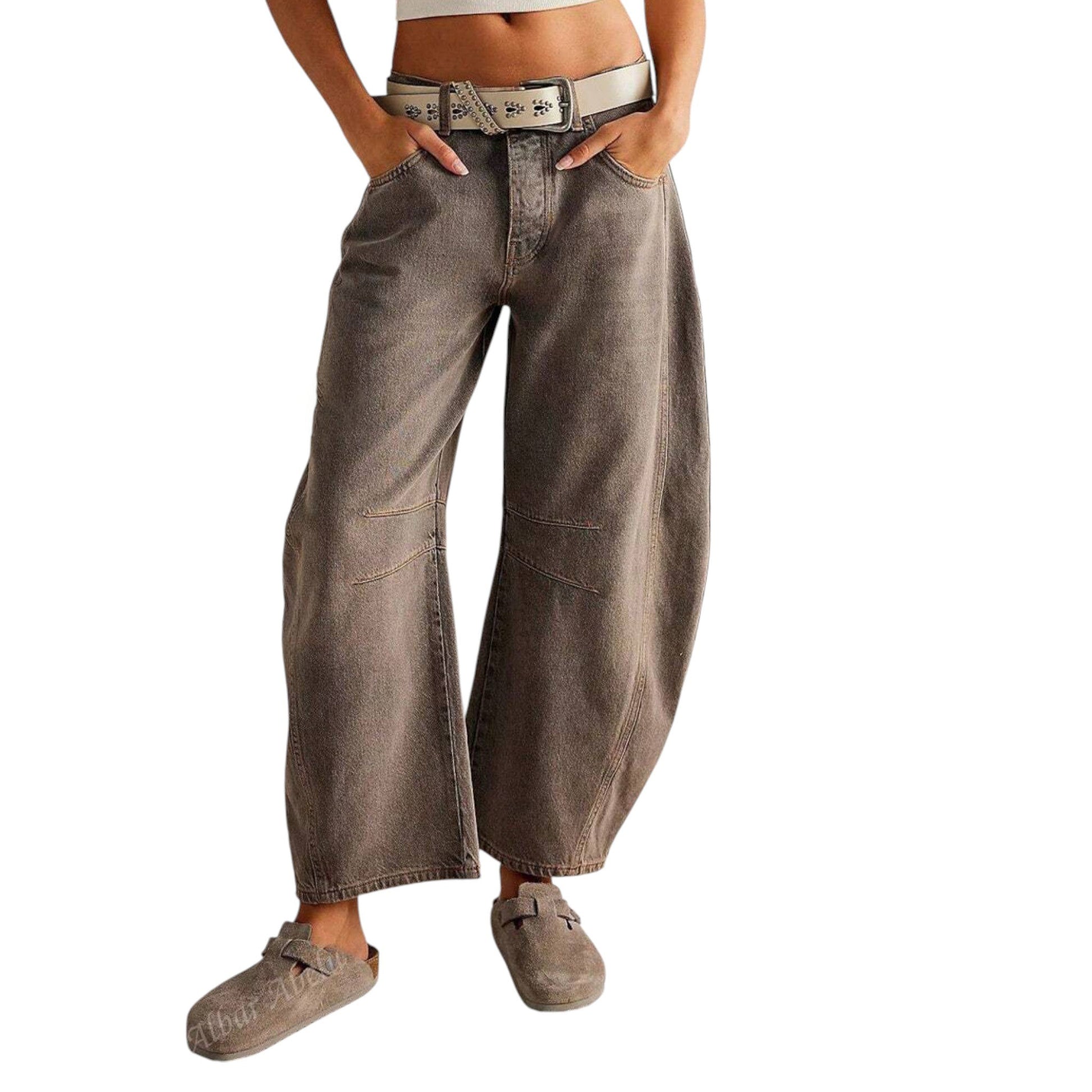 Címke nélküli, barna, alacsony derekú, széles szárú farmer, zsebekkel.
