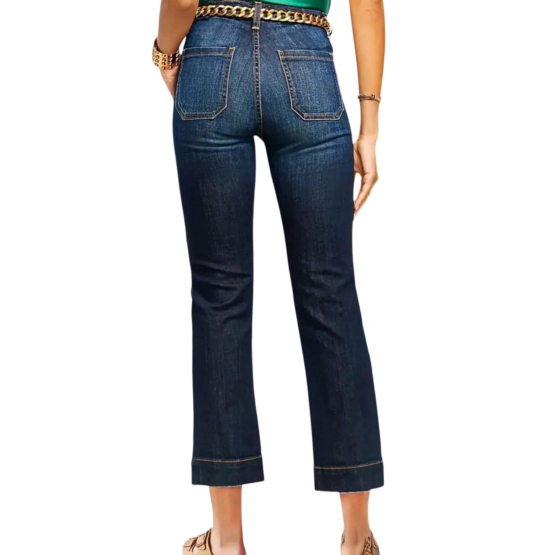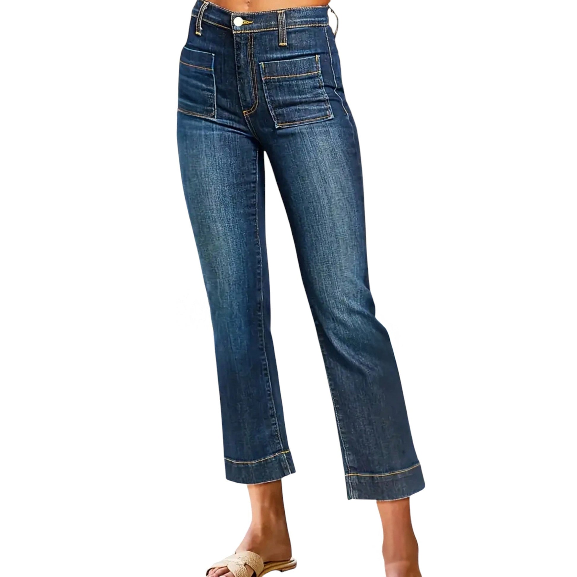 Címke nélküli, sötétkék, magas derekú, egyenes szárú farmer, elől rávarrt zsebekkel.