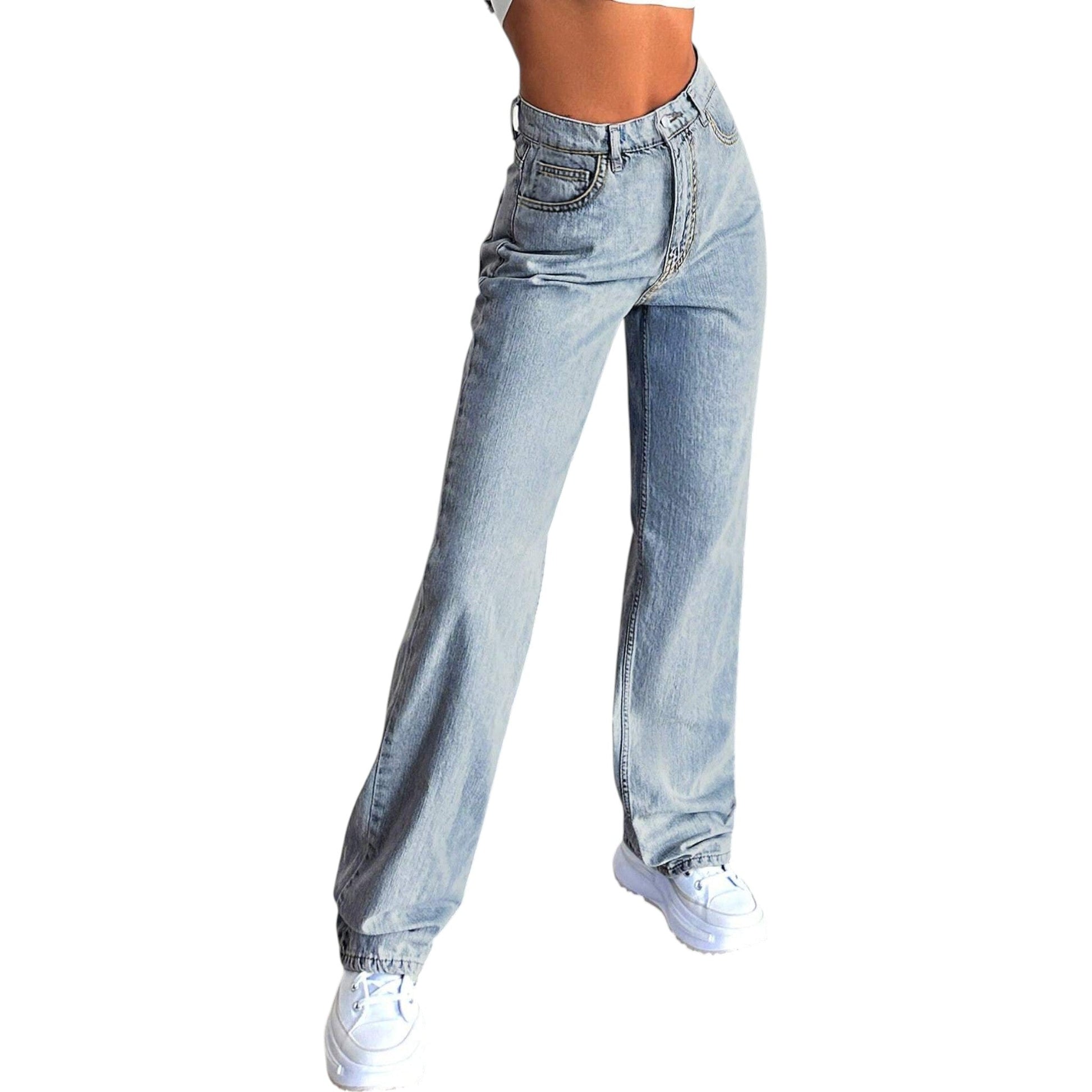 Címke nélküli, világoskék, egyenes szárú, magas derekú farmer nadrág.