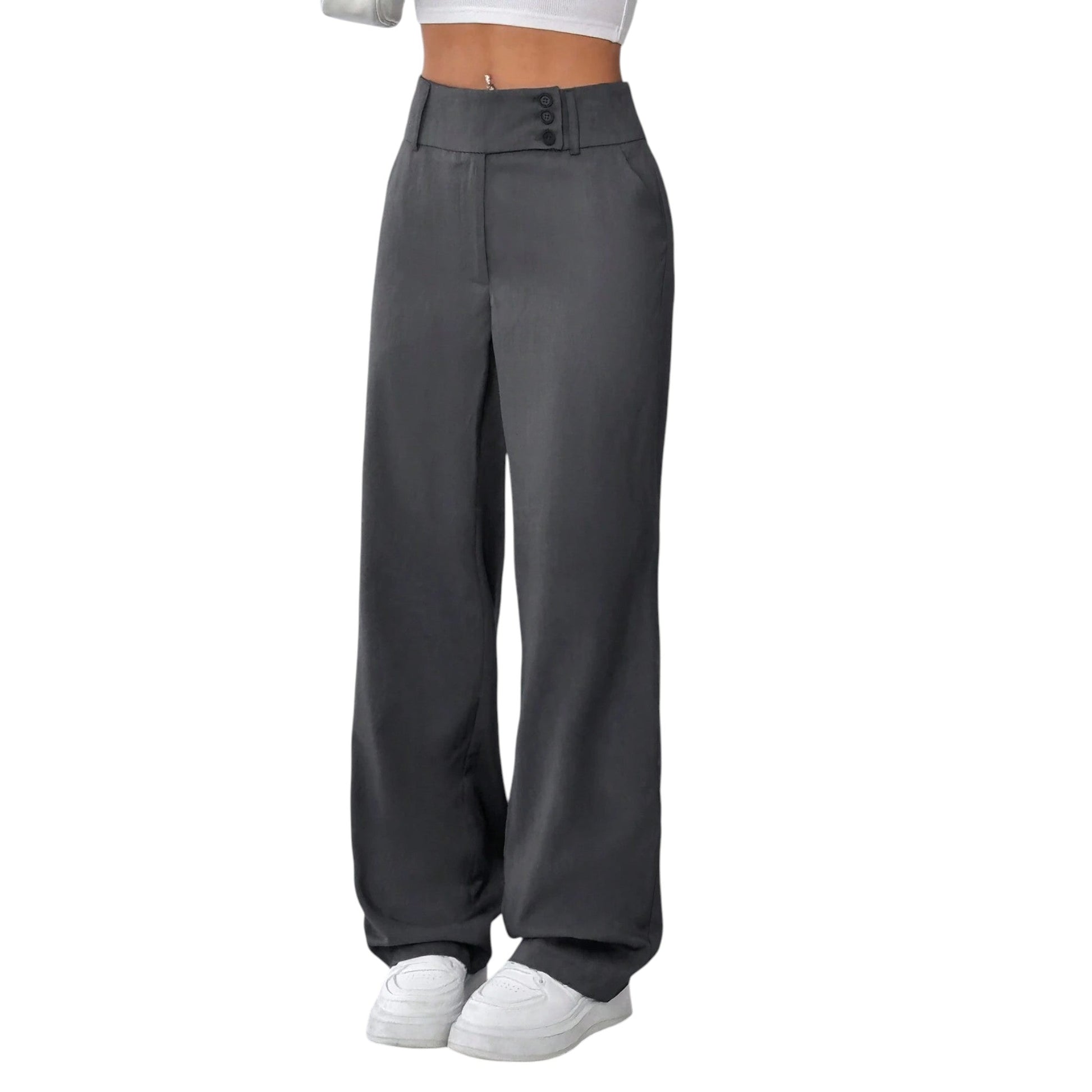 Címke nélküli, szürke, magas derekú, egyenes szárú nadrág, elől gombokkal.