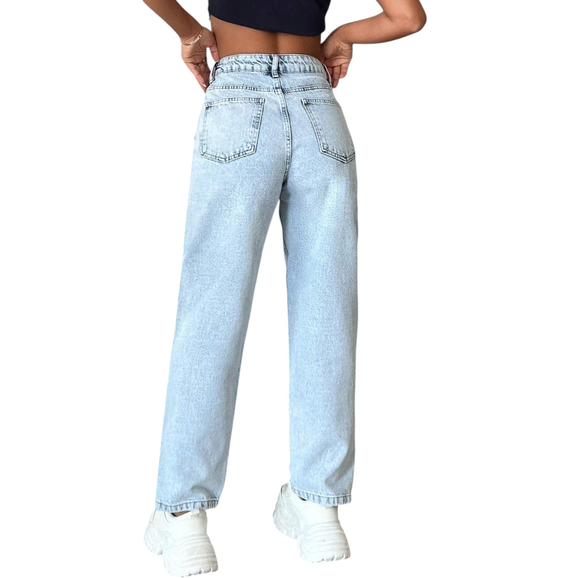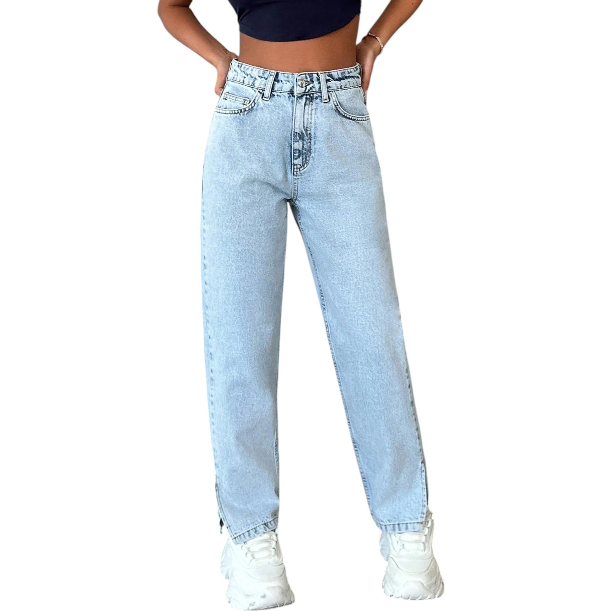 Címke nélküli, világoskék, magas derekú, egyenes szárú farmer nadrág, oldalt sliccelve.