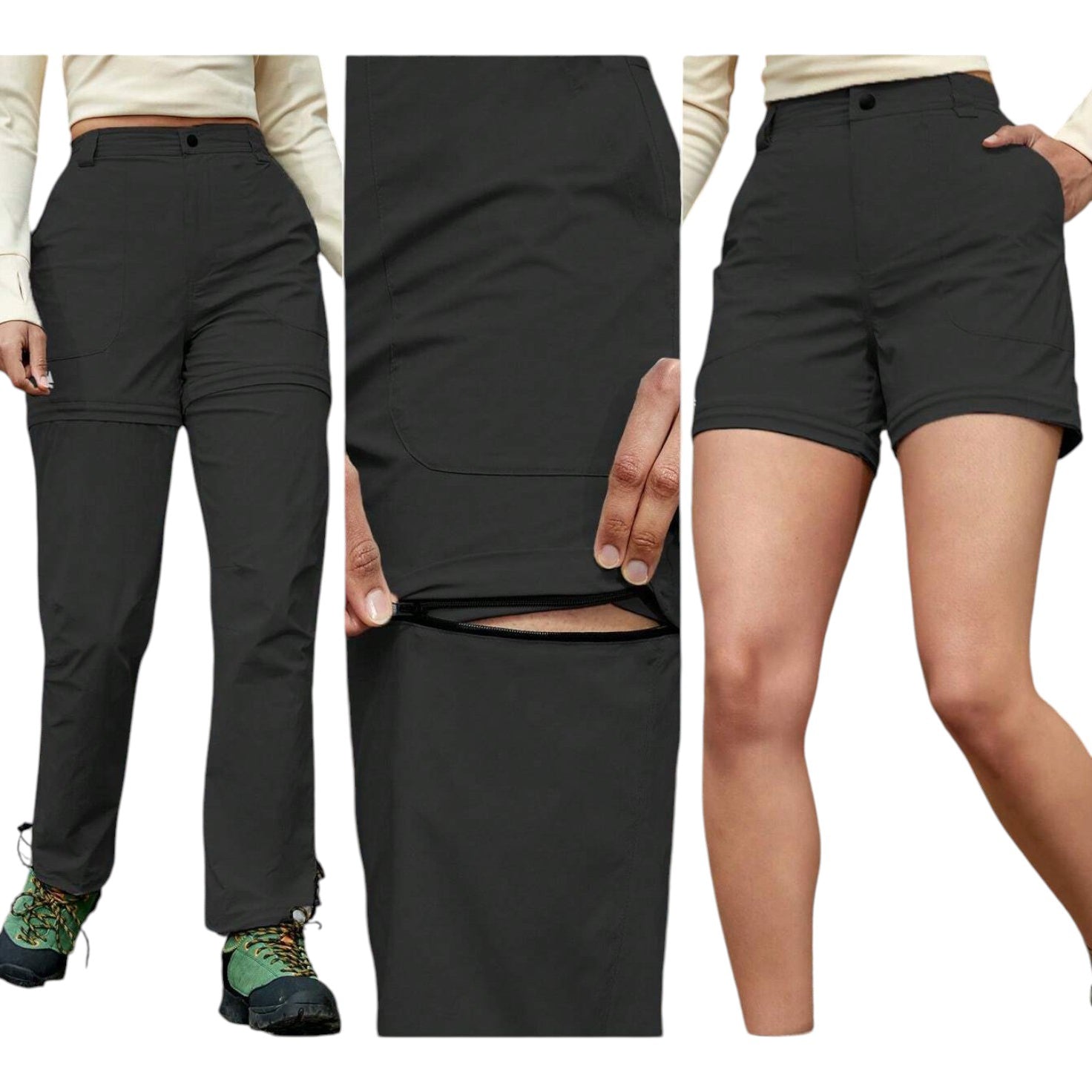 Címke nélküli, fekete, lecipzározható túranadrág, amely térd alatt cipzárral rövidnadrággá alakítható, zsebekkel.
