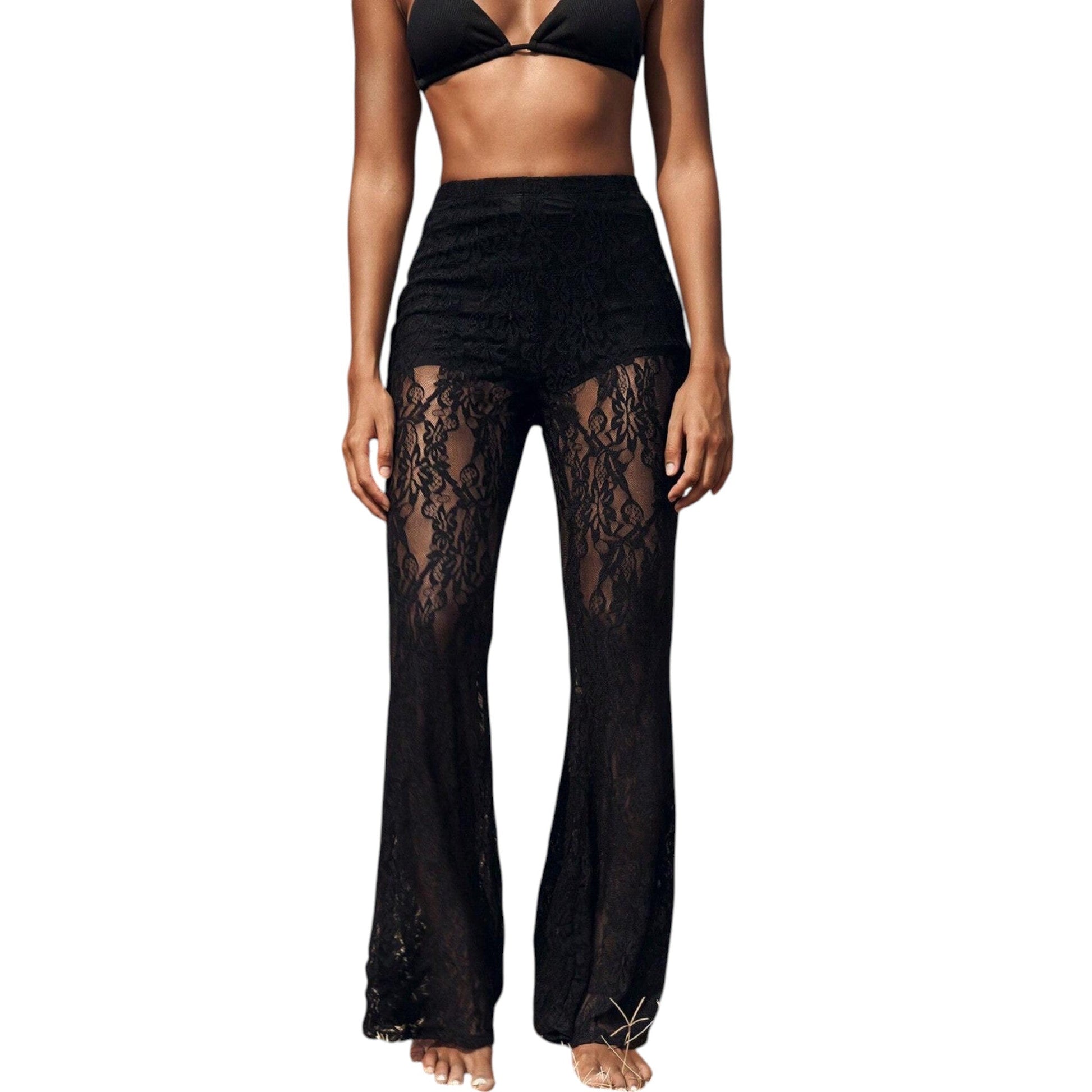 Címke nélküli, fekete, magas derekú, áttetsző csipke, bő szárú nadrág.