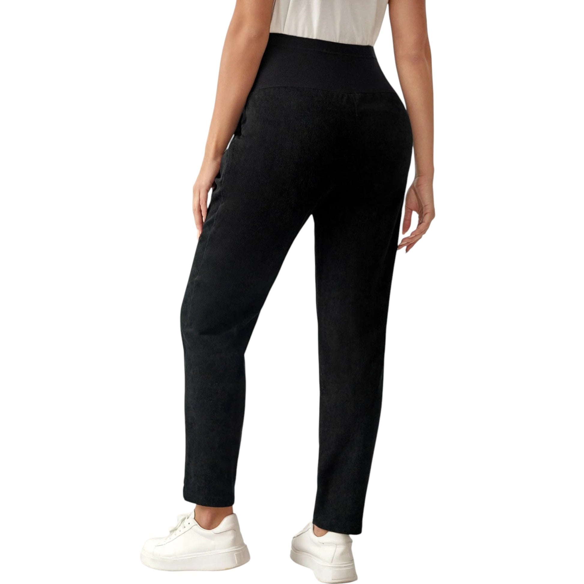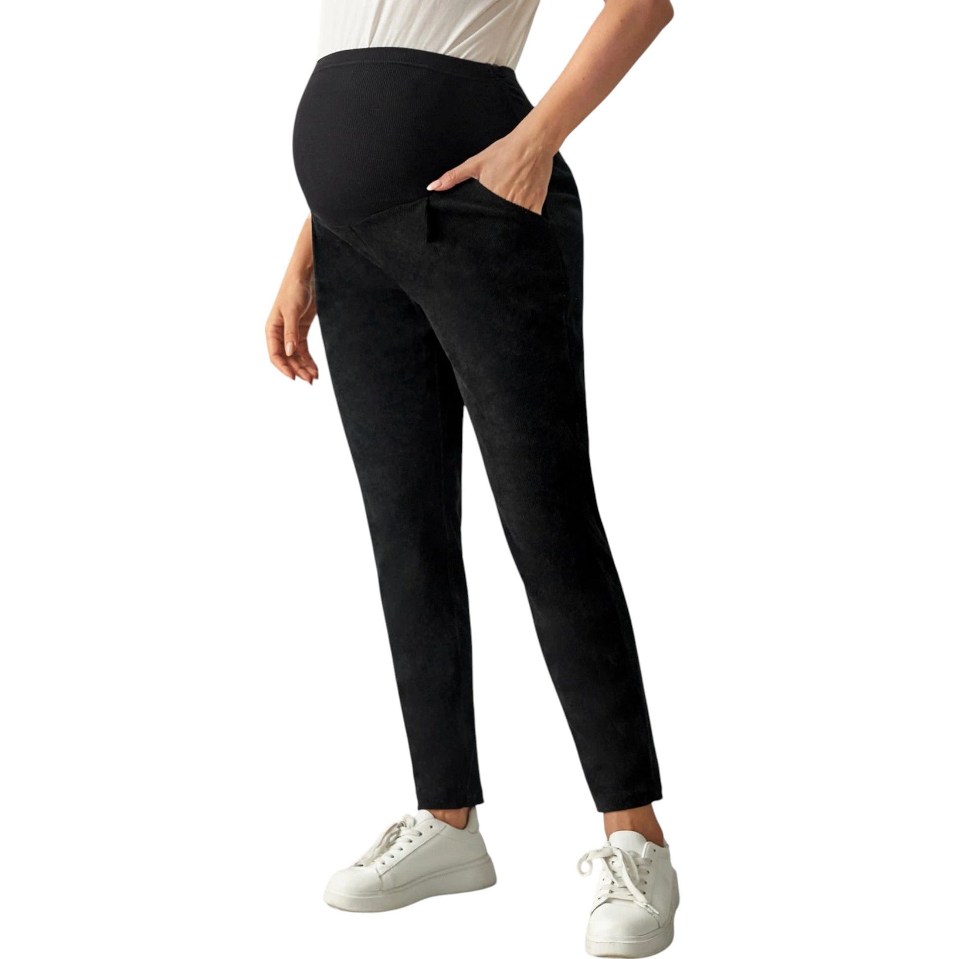 Címke nélküli, fekete, slim fit, magas derekú kismama nadrág, oldalt zsebekkel.
