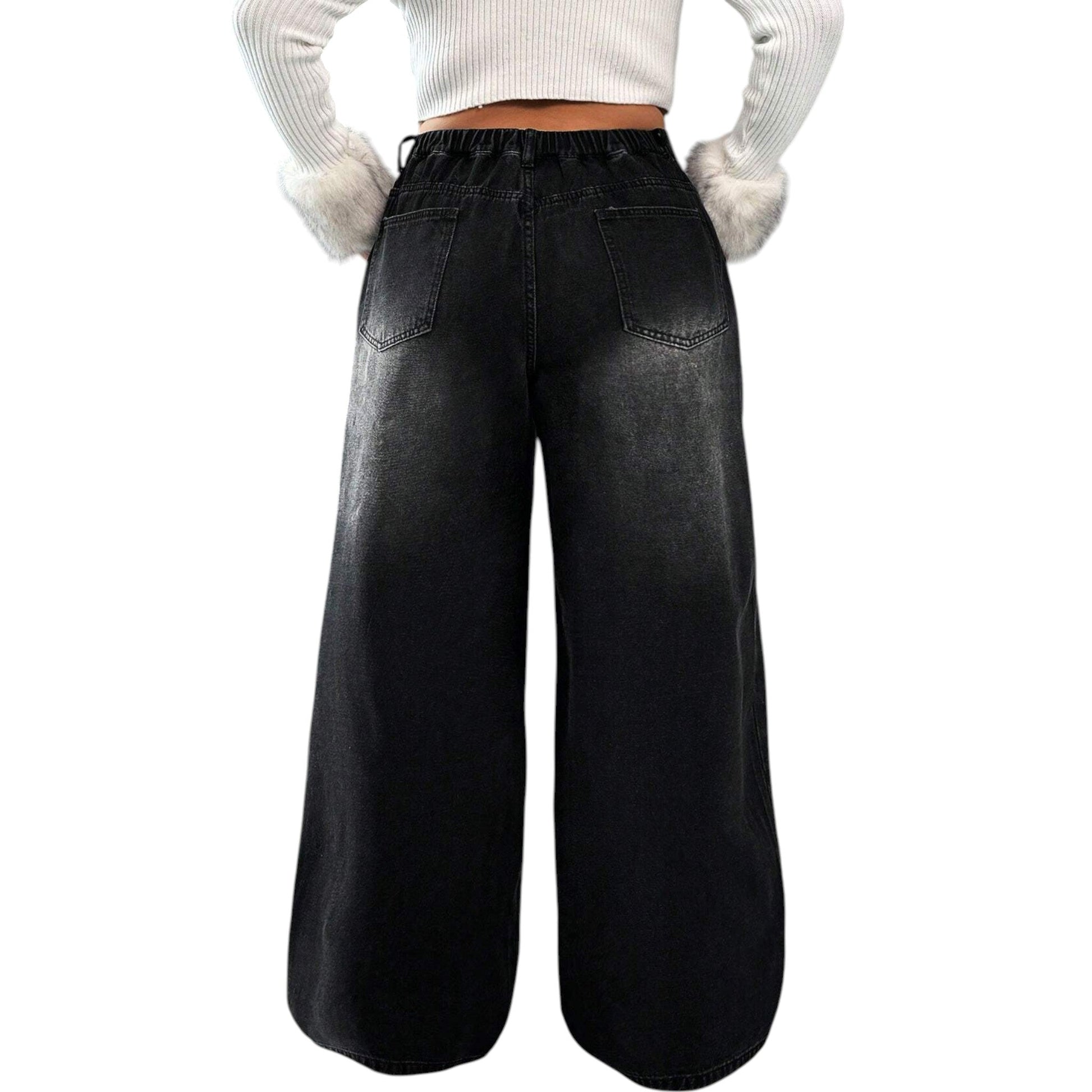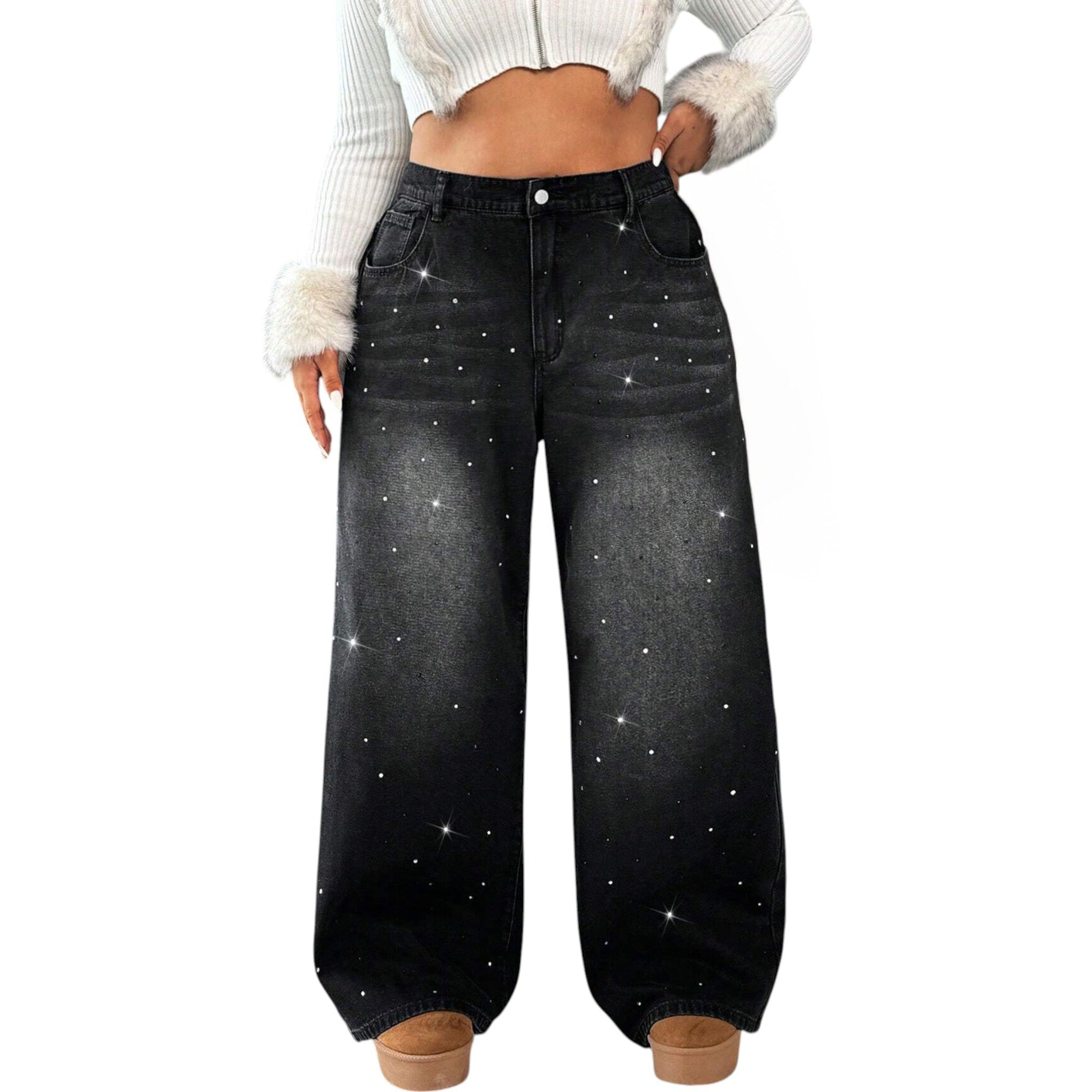 Címke nélküli, fekete, koptatott, magas derekú, bő szárú farmer nadrág, strasszokkal díszítve.