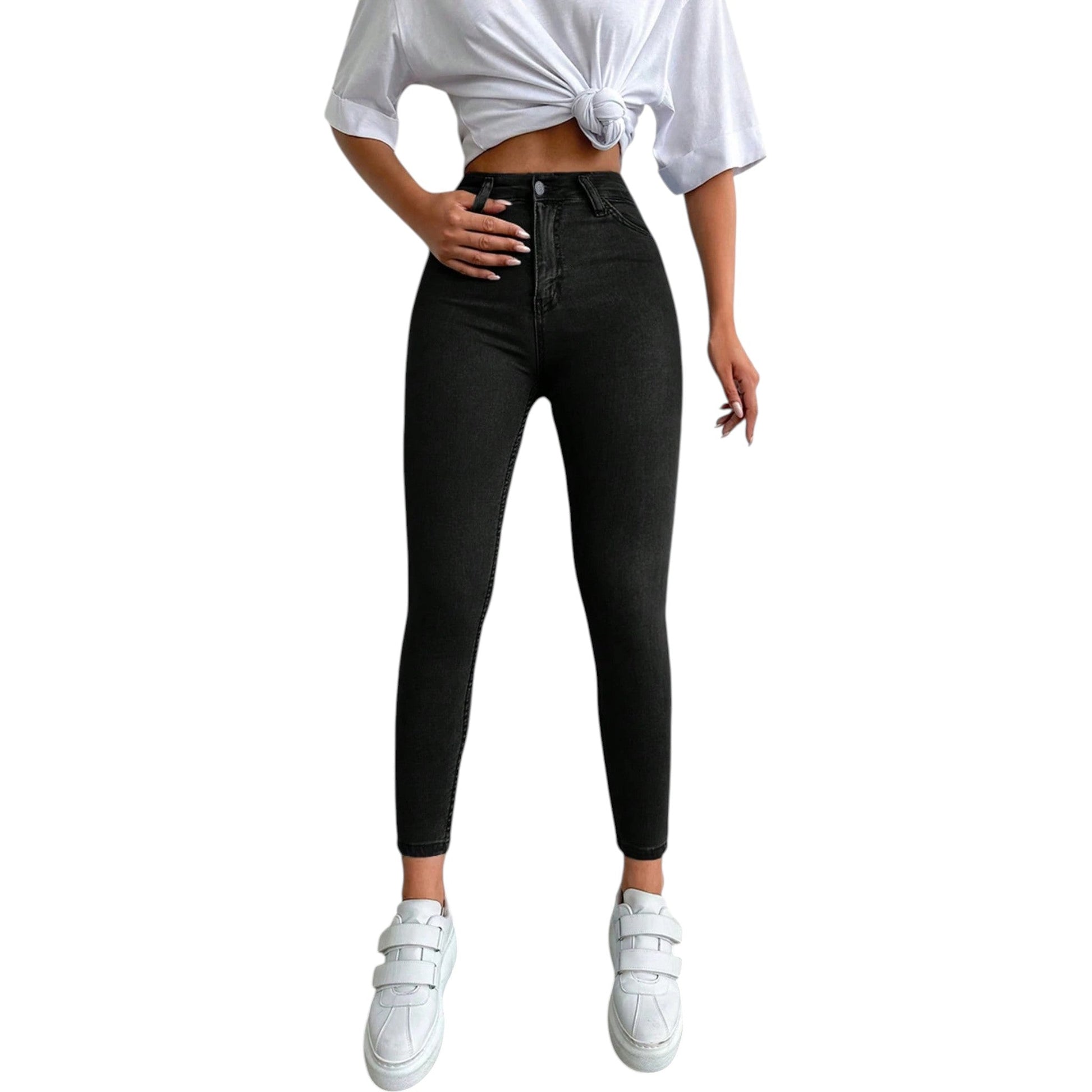 Címke nélküli, fekete, magas derekú, slim fit farmer.