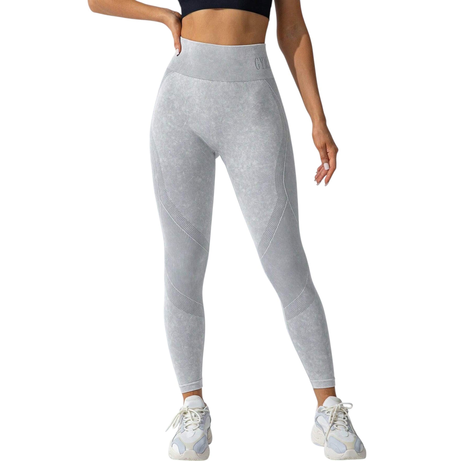 Címke nélküli, szürke melírozott, magas derekú, varrás nélküli leggings bordázott és mintás részletekkel a lábakon.
