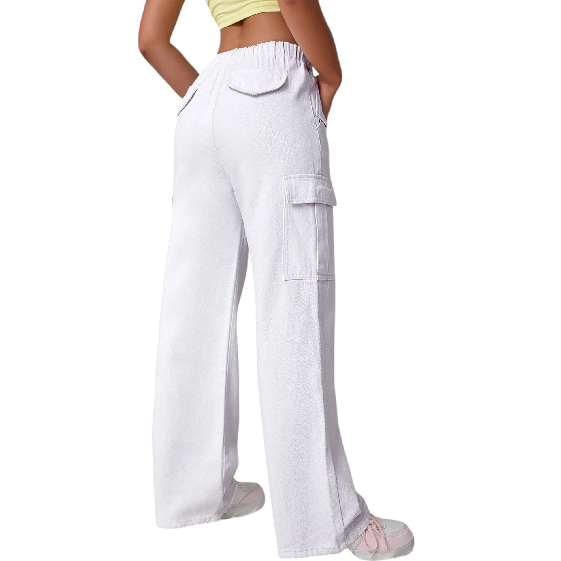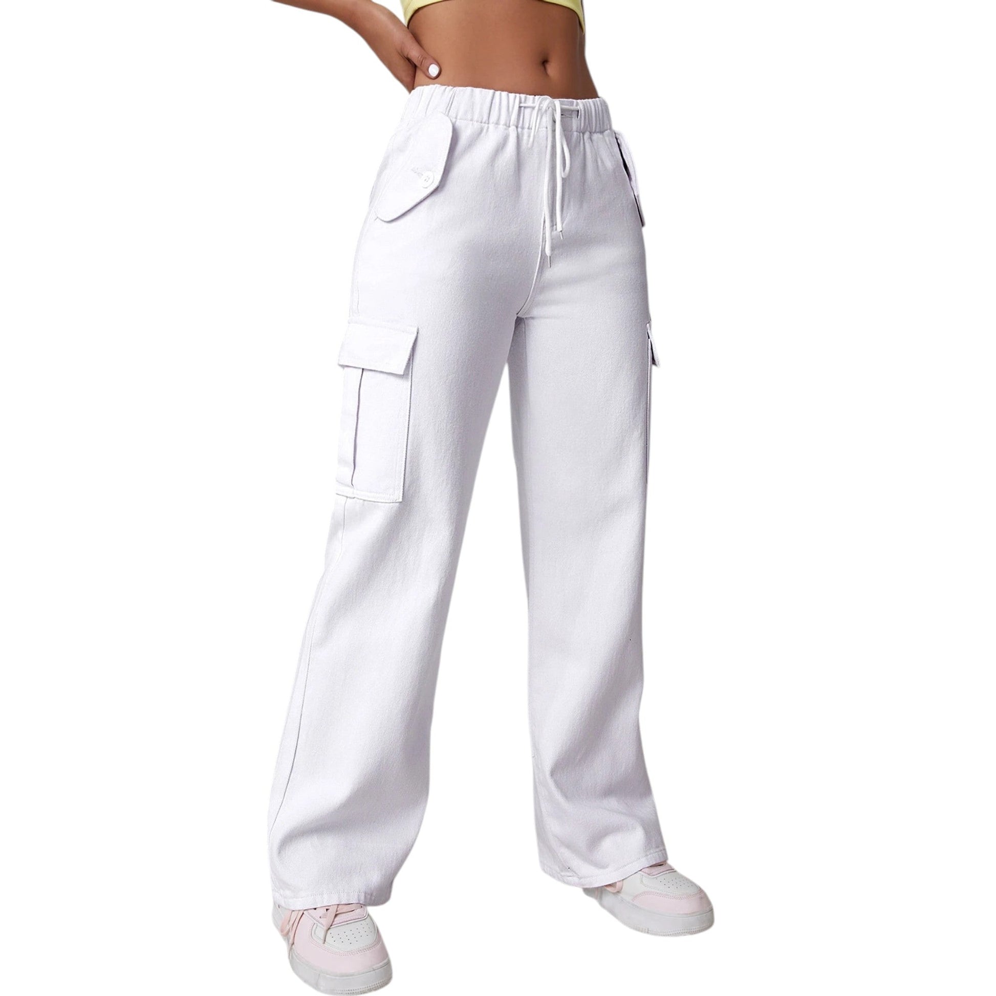 Címke nélküli, fehér, magas derekú, bő szárú cargo nadrág húzózsinóros derékkal és oldalsó zsebekkel.