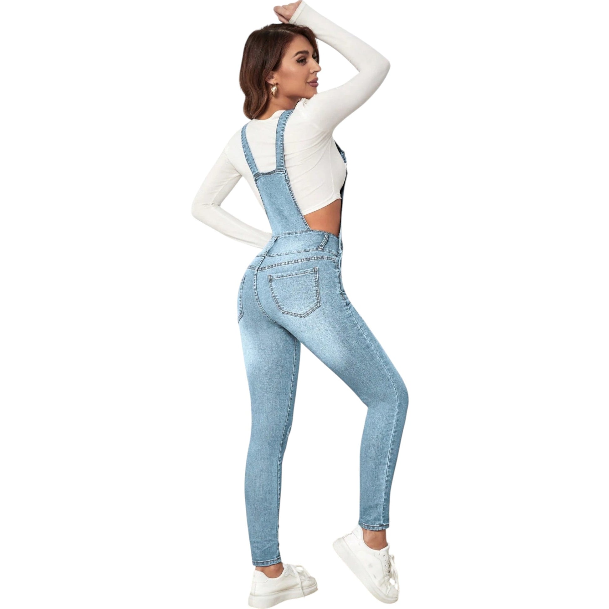 Címke nélküli, világoskék, skinny fit, szaggatott farmer overál állítható pántokkal és oldalsó gombos záródással.