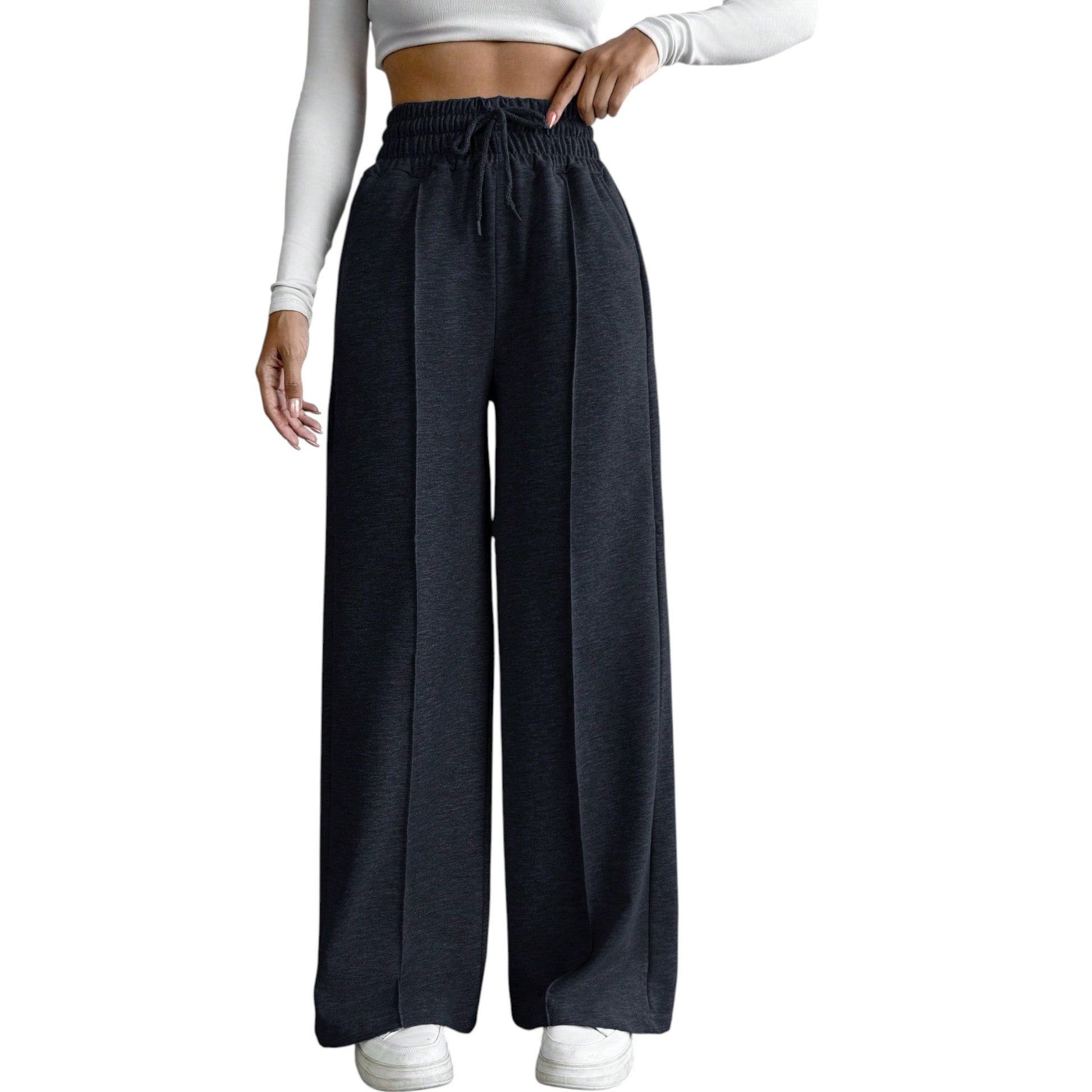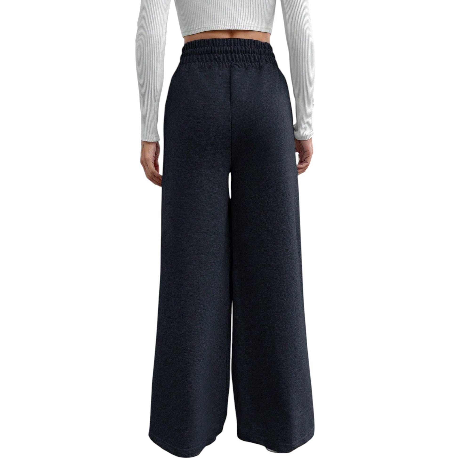 Címke nélküli, fekete, magas derekú, húzózsinóros, bő szárú melegítő nadrág.