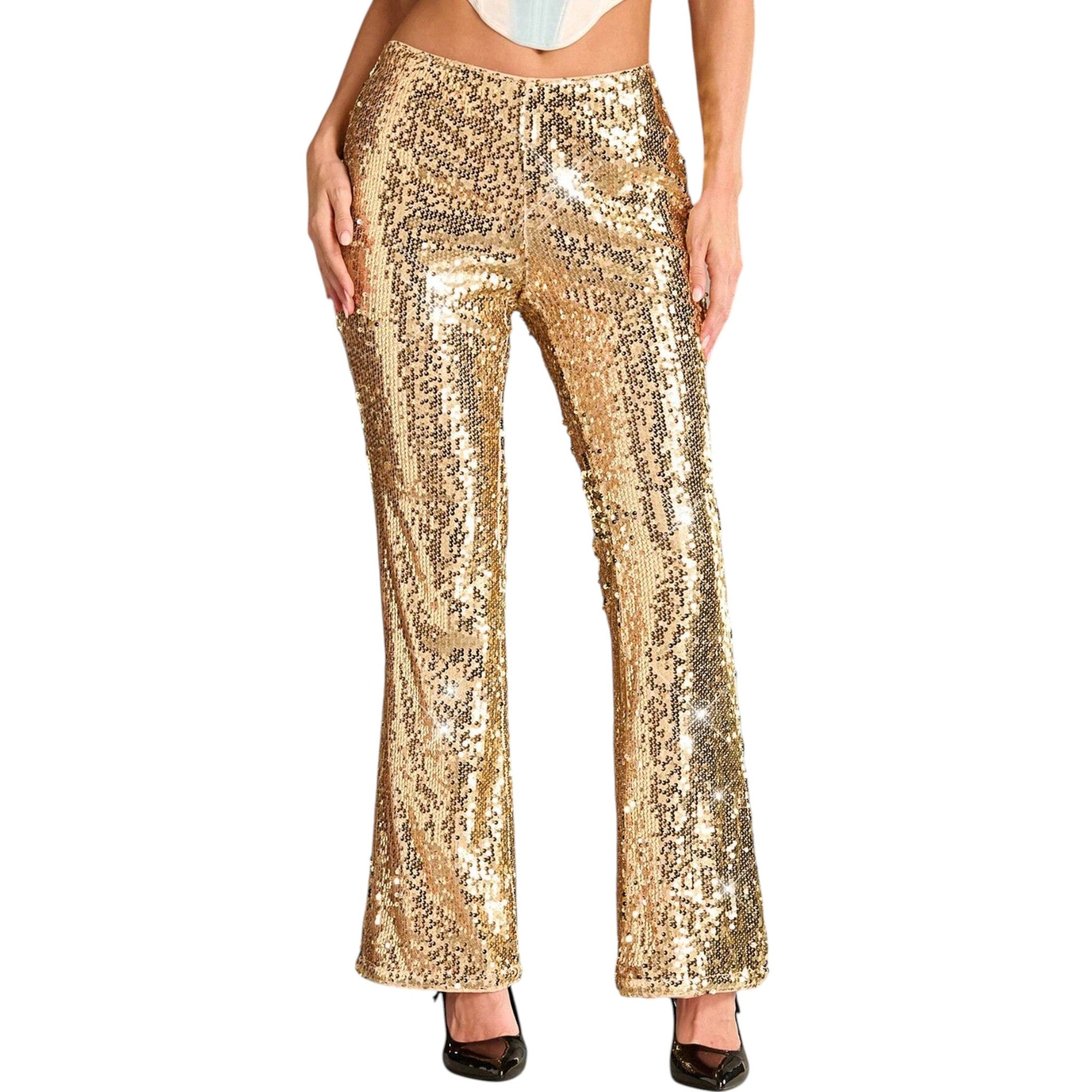 Címke nélküli, arany, magas derekú, flitteres, enyhén bővülő szárú nadrág.