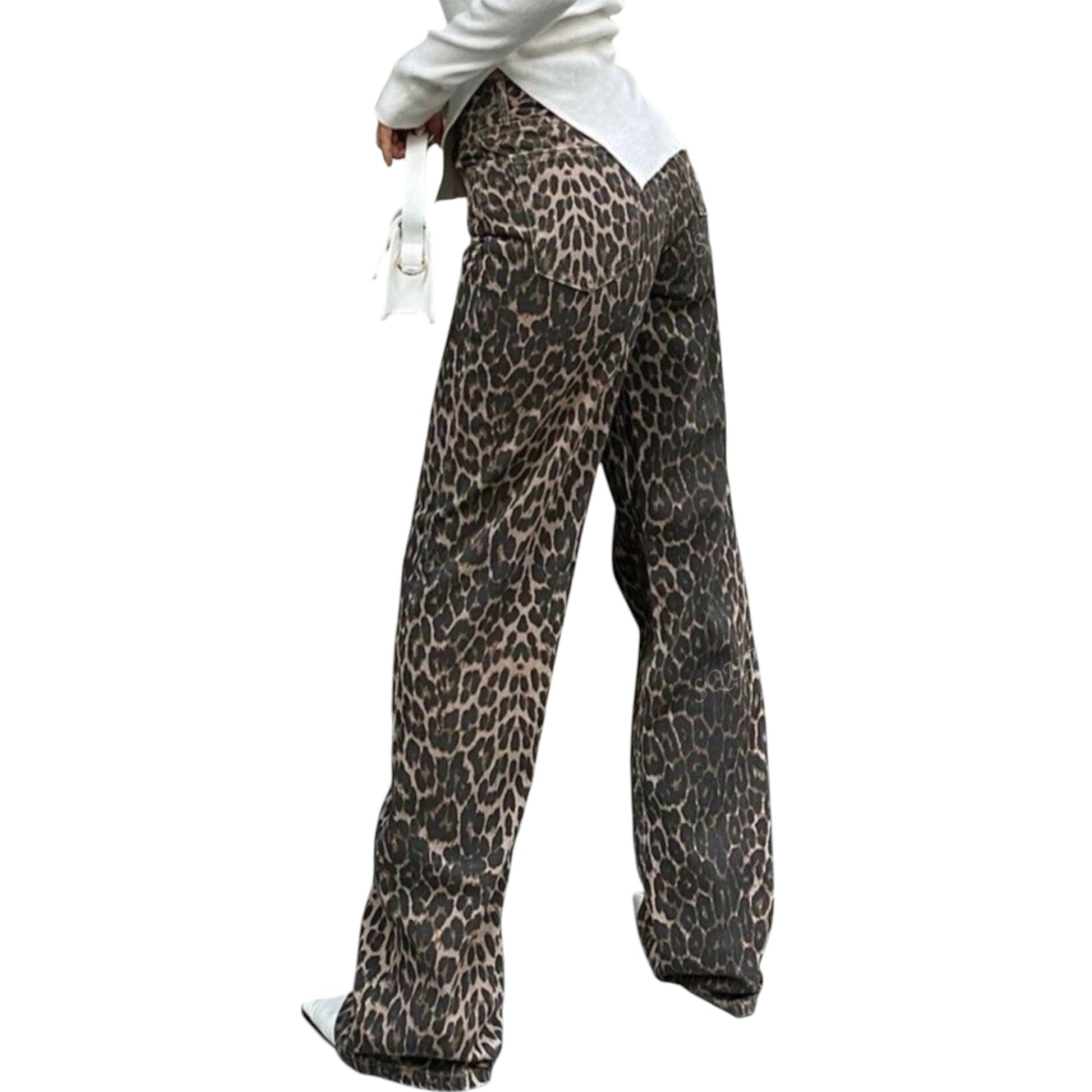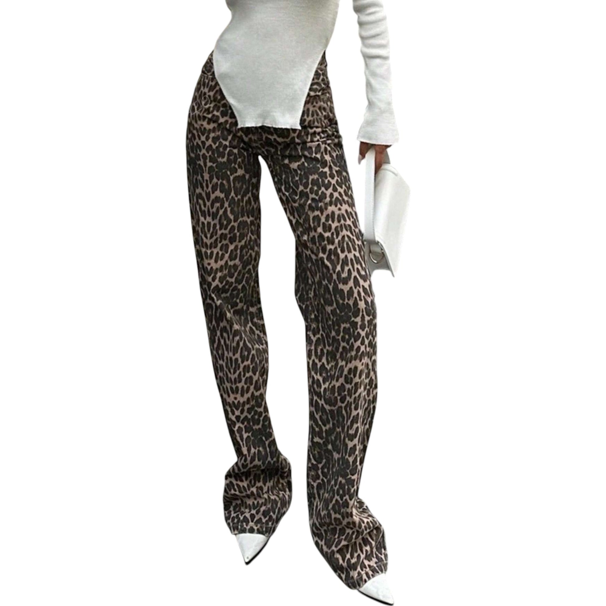 Címke nélküli, leopárdmintás, magas derekú, egyenes szárú nadrág.