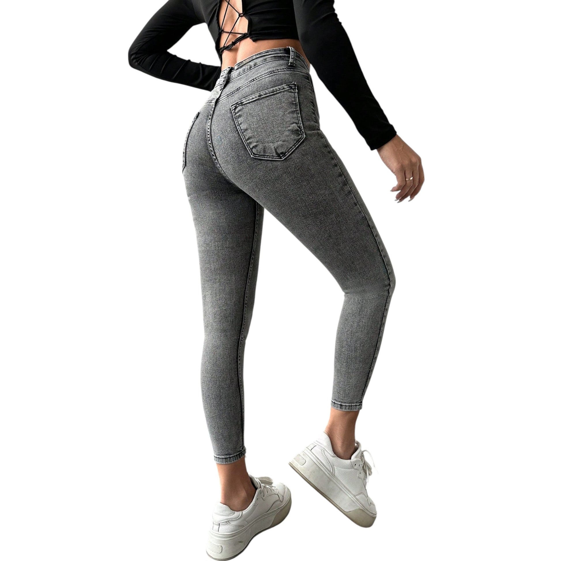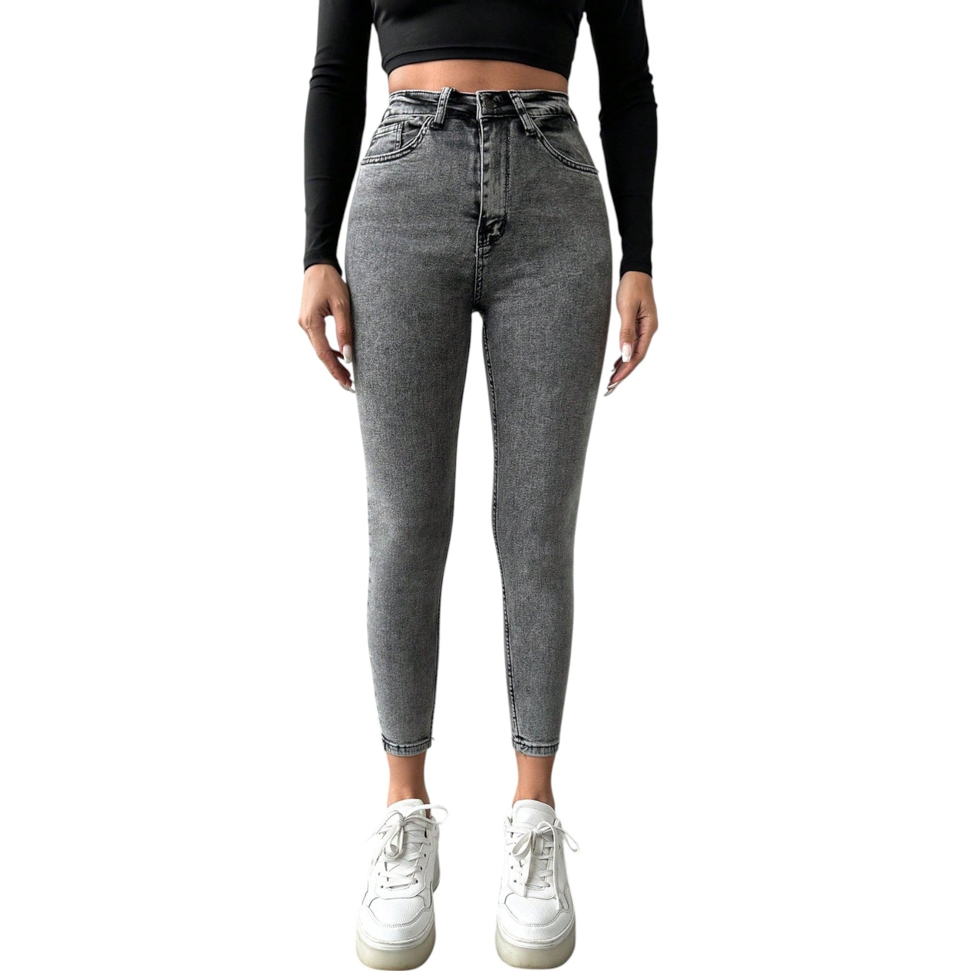 Címke nélküli, szürke, magas derekú, szűk fazonú farmer nadrág.