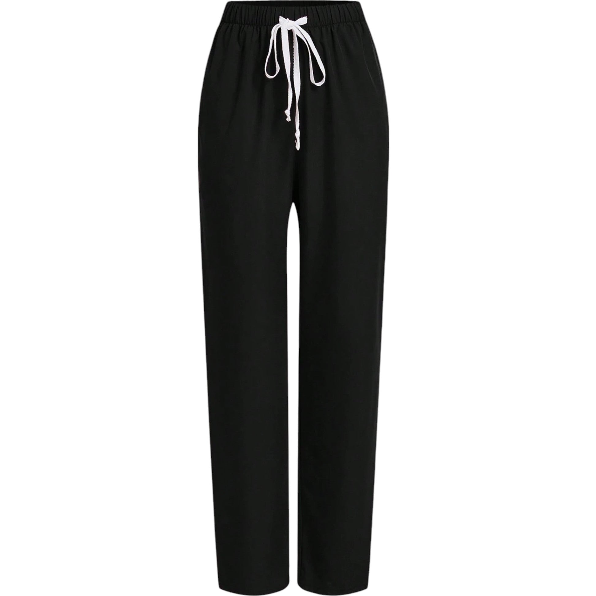 Címke nélküli, fekete, megkötős, egyenes szárú nadrág.
