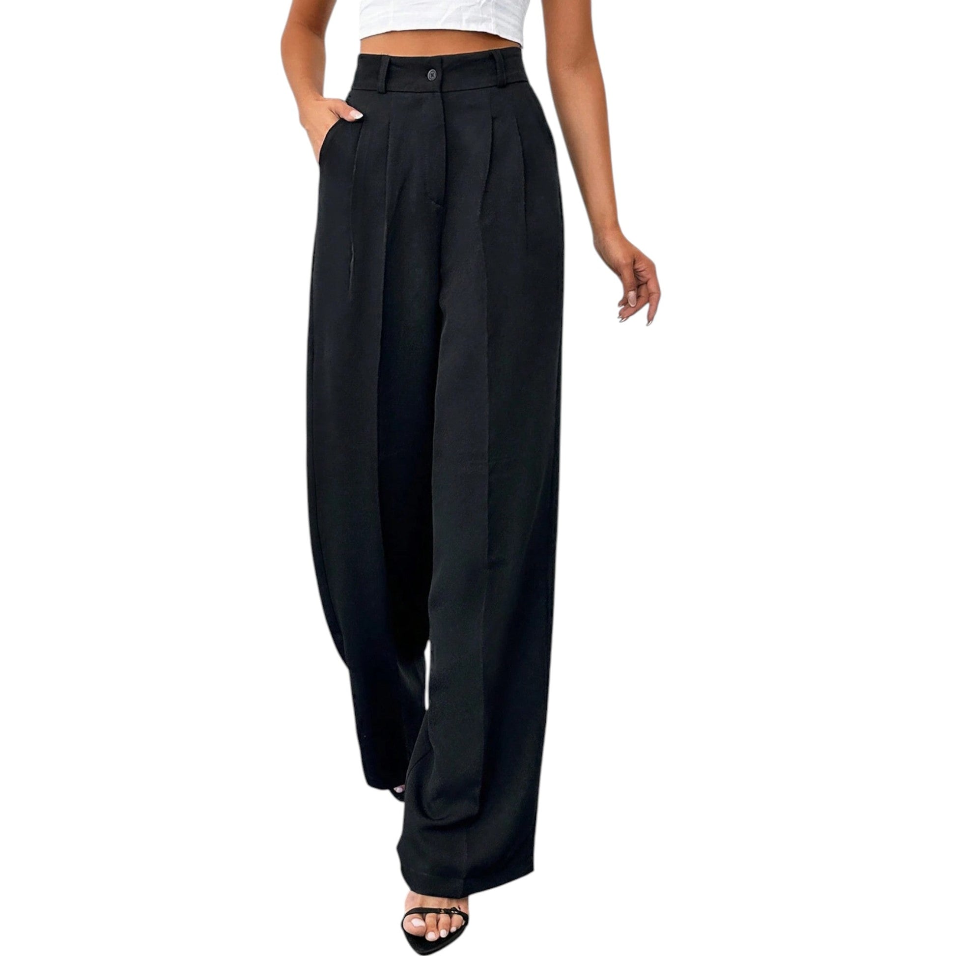 Címke nélküli, fekete, magas derekú, pliszírozott, zsebes, széles szárú nadrág.
