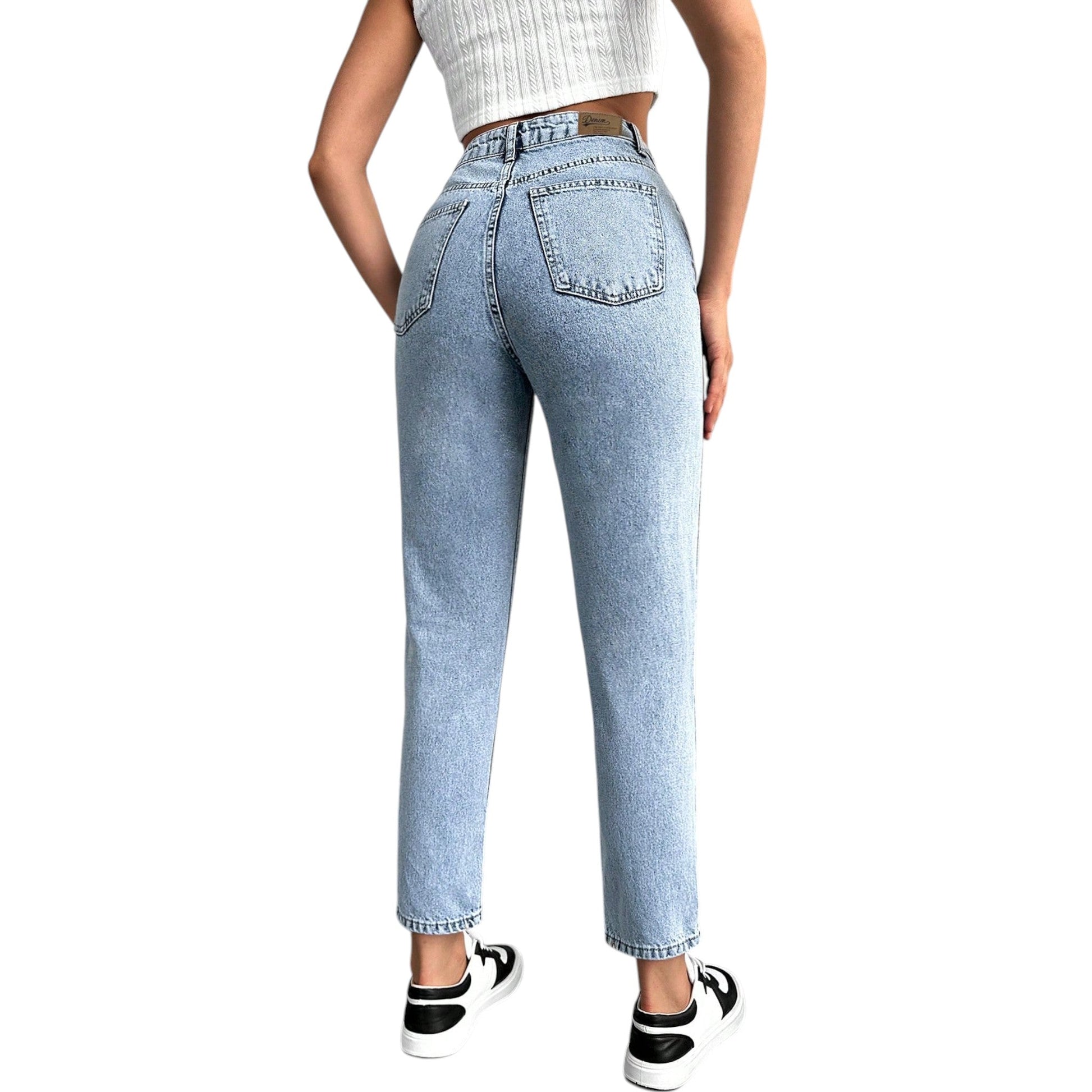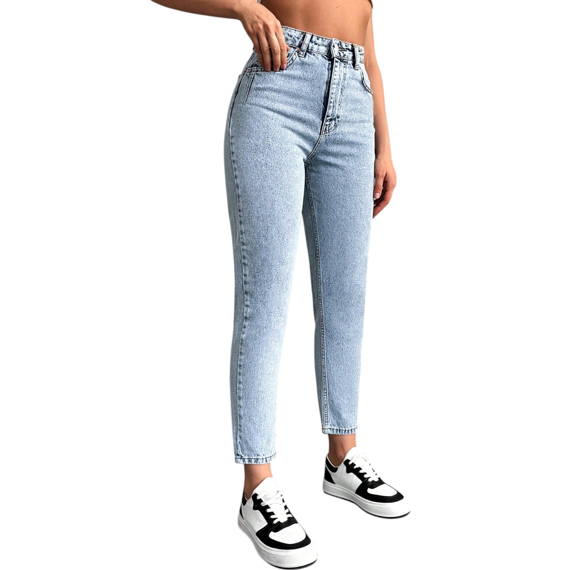 Címke nélküli, kék színű, farmer nadrág, magas derekú és szűk szárú.