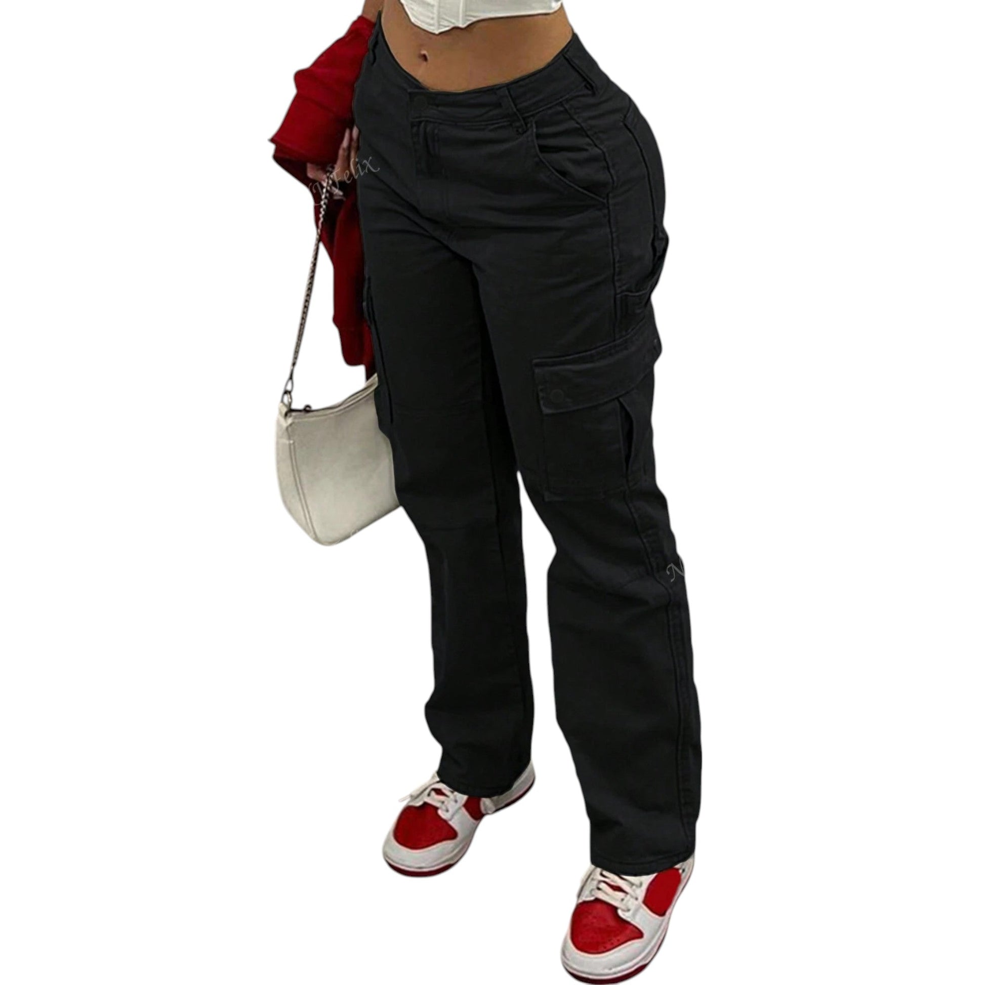 Címke nélküli, fekete színű, cargo nadrág, zsebekkel.
